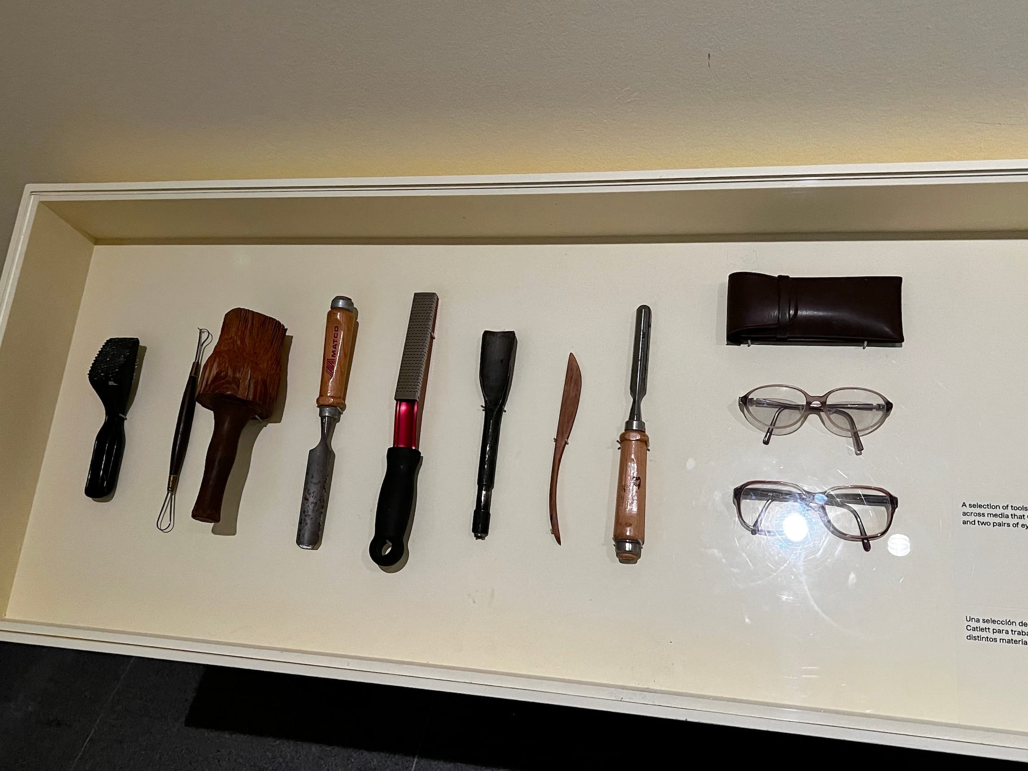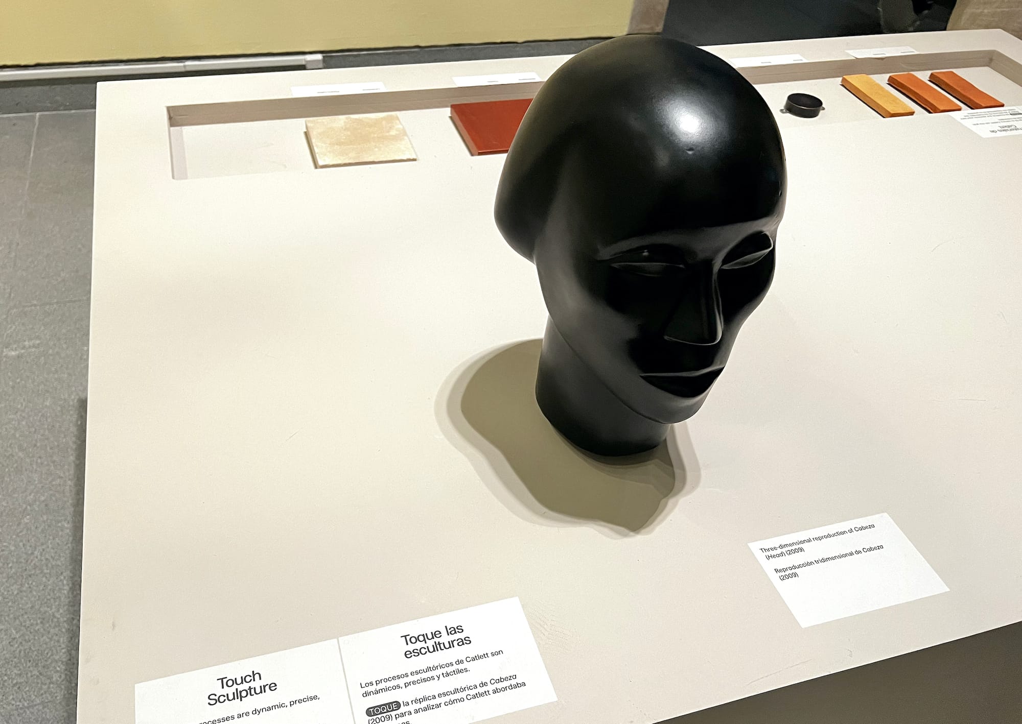 Interactive spaces for immersion, play, and reflection follow the presentation of Catlett’s immense oeuvre. An enlarged photograph of her studio in Cuernavaca is juxtaposed with a video of her working in her studio and a display case containing different carving tools she used. An installation of different stone, wood, and metal samples, as well as a three-dimensional replica of her “Cabeza/ Head”(2009), provide opportunities to physically touch the materials and shapes that defined her sculptural practice. A visual poetry activity in the gallery includes imagery from Catlett’s work reproduced as magnets that can be moved into different formations, much like the visual repetition in her printmaking practice.