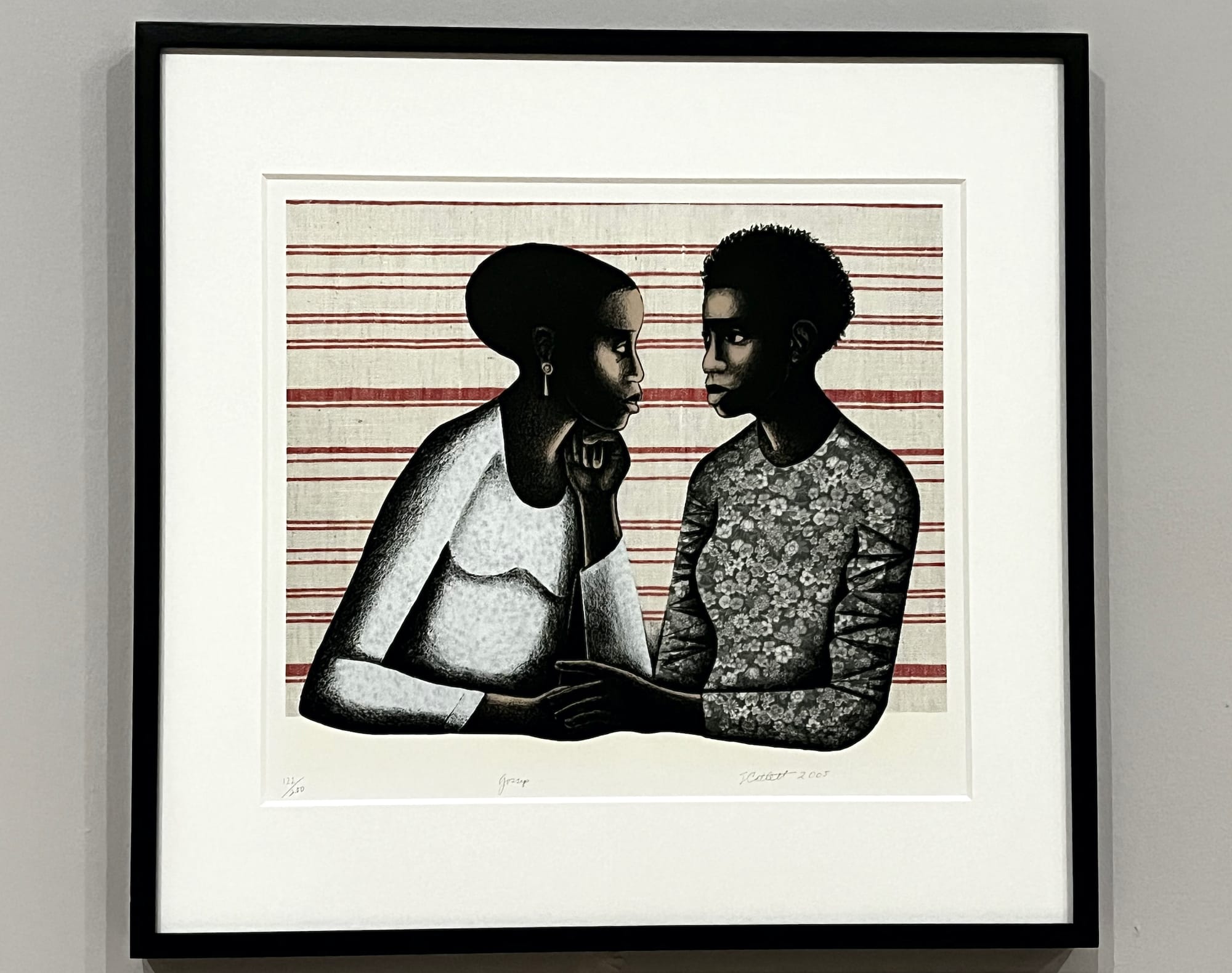 Nearby is “Political Prisoner” (1971), a sculpture of a Black woman with her arms linked behind her back and the Pan-African colors red, black, and green in the center, installed in front of a blown-up wall image of Davis being arrested. Displayed together, these works convey Catlett’s profound respect for Davis that she channeled into her art as well as her political organizing for the latter’s freedom. “Black Unity” (1969), a massive fist carved in cedar, further communicates the artist’s commitment to Black liberation, while other works affirm quieter forms of women’s resistance: “Links Together” (1996) portrays three Black women connected by their hands and symbolic stitching and weaving of the decorative cloth patterns on their shirts. In “Gossip” (2005), two Black women are deeply engaged in a conversation with one another — an oft-dismissed method of women’s empowerment.