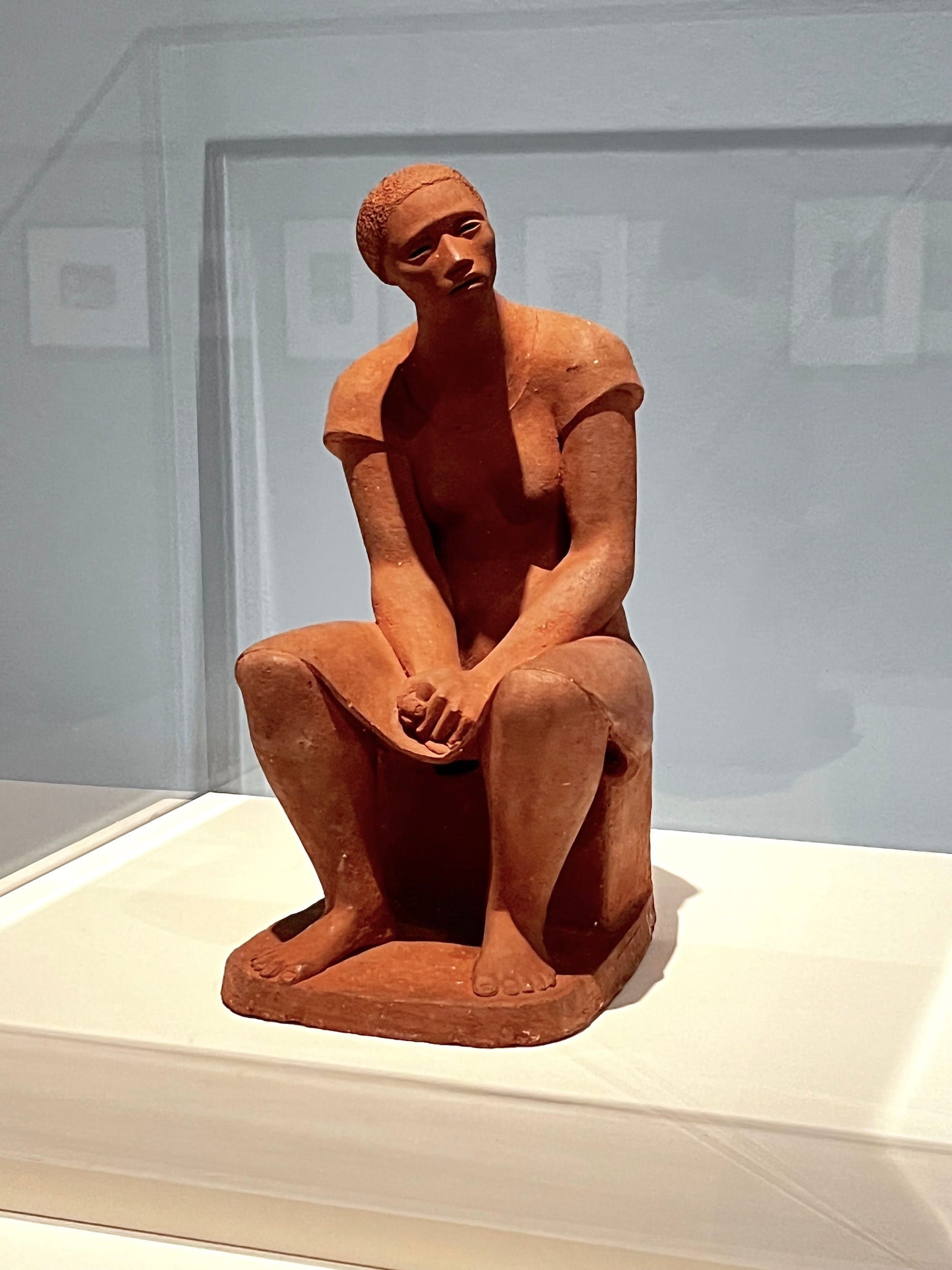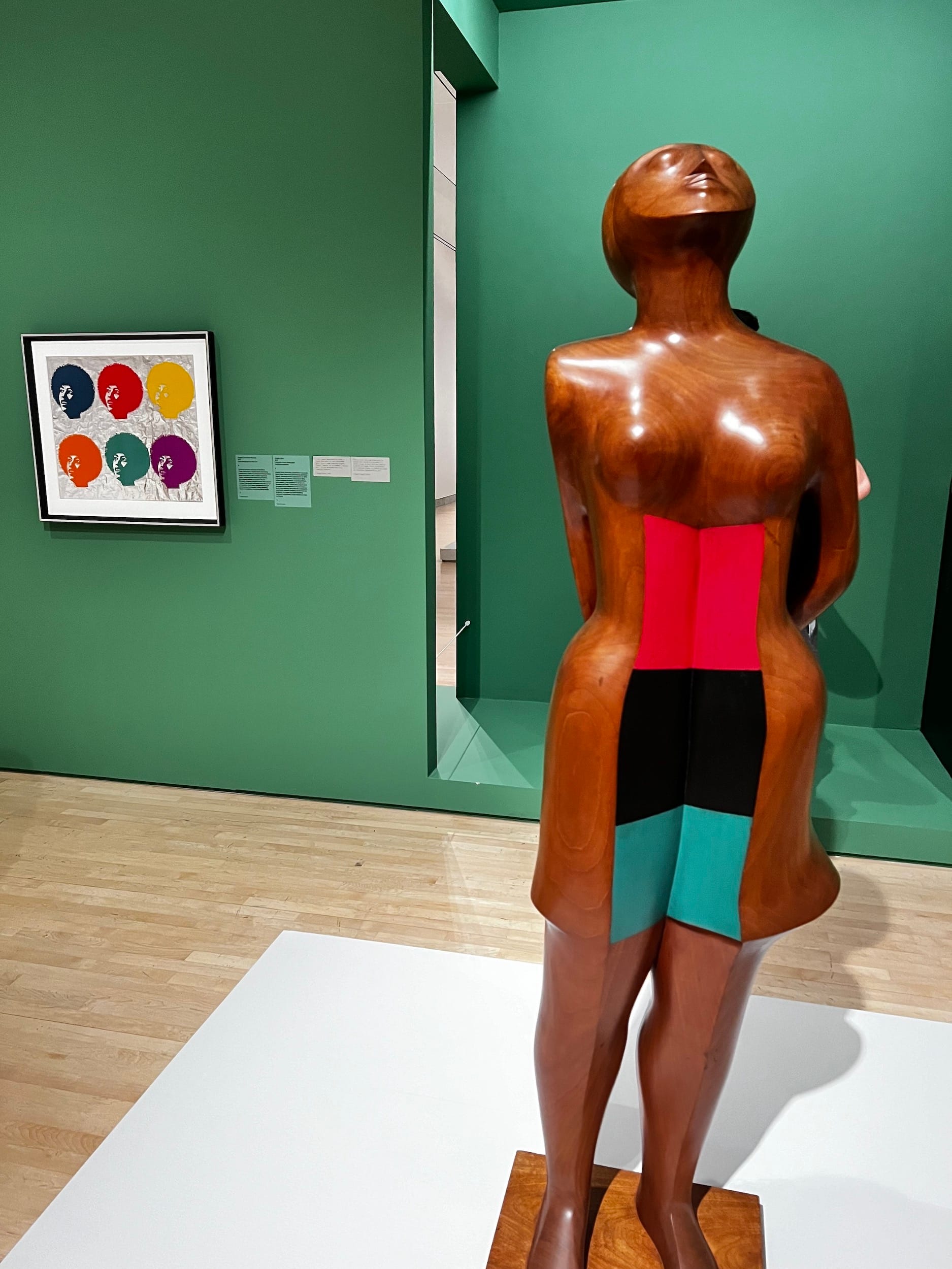 Radical artists in the countercultural 1960s often encouraged each other to draw on ancestral roots, whether they be African or Mesoamerican, as a decolonial aesthetic strategy. One display most illustrative of this notion is a large white platform filled with around 14 sculptures of varying wood, ceramic, and stone materials showing abstract figures in different poses. Many of the sculptures evoke the style of African masks carved into materials associated with the Mesoamerican tradition and native to Mexico. On the platform is “Homage to My Young Black Sisters,” a red cedar sculpture with unique historical significance: the figure's stretched Black Power fist and the revelatory title signal the extension of Catlett’s solidarity with younger generations of Black women continuing the liberation struggle.