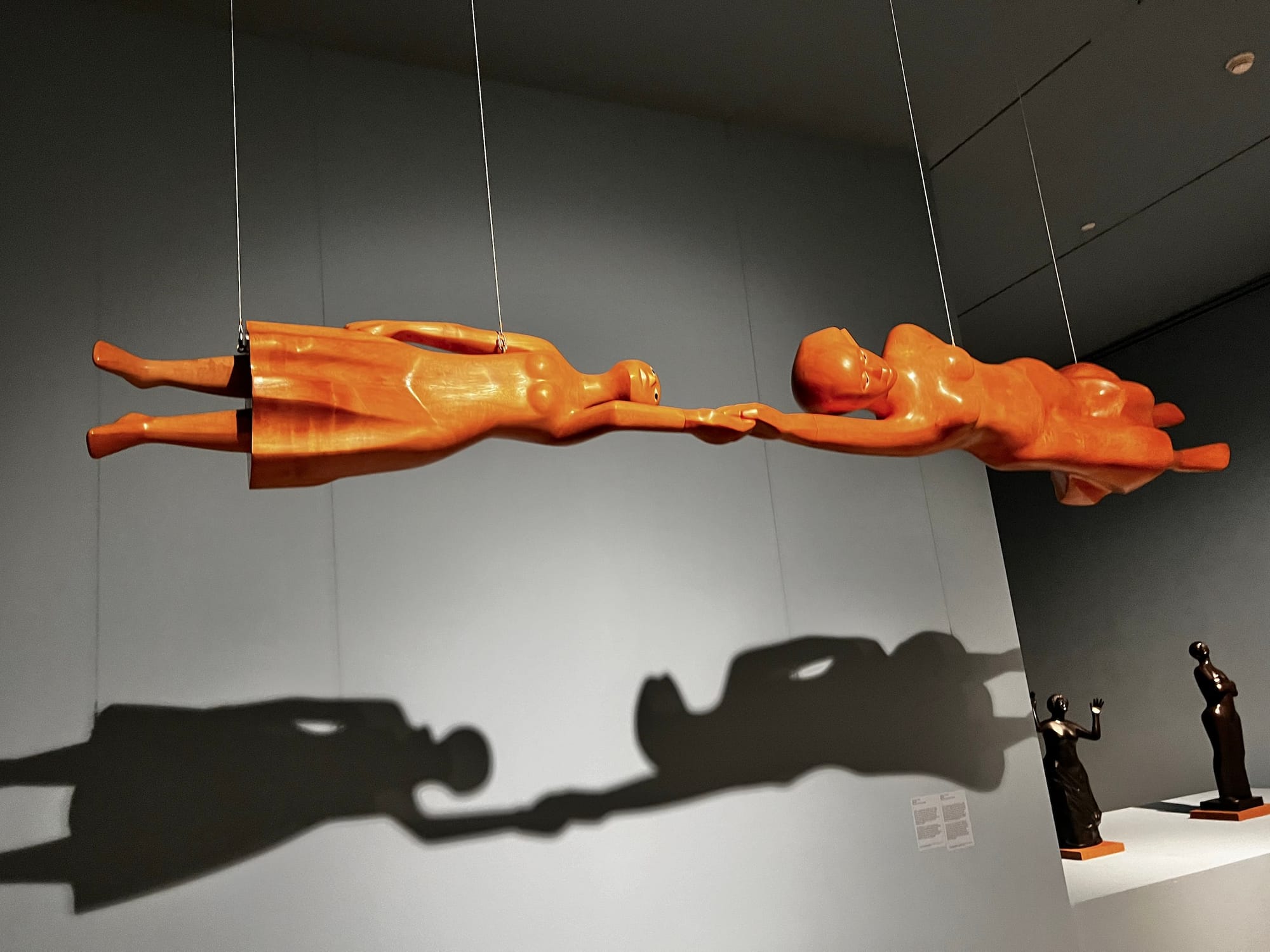 The final gallery is dedicated to Catlett’s public art practice, including original works and representations of public art from cities such as Atlanta, New Orleans, New York, and Chicago. Suspended from the ceiling, a mother and daughter hold hands in “Floating Family” (1995–96). The sculpture, carved from Mexican primavera wood, is normally in its home at the Chicago Public Library but was loaned for the traveling retrospective. Although their outstretched arms indicate distance between them, the mother and daughter hold tight to one another in perpetuity. The sense of intergenerational continuity and radical kinship radiating from the work is a testament to Catlett’s deep, abiding love for community that continued throughout her life.