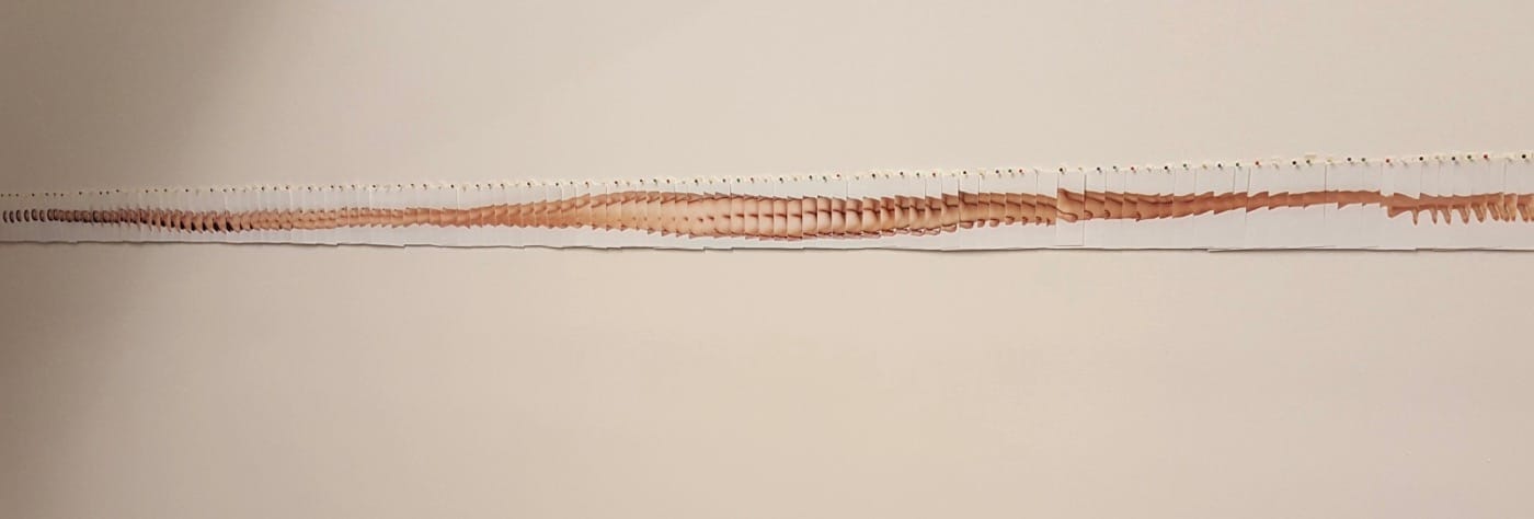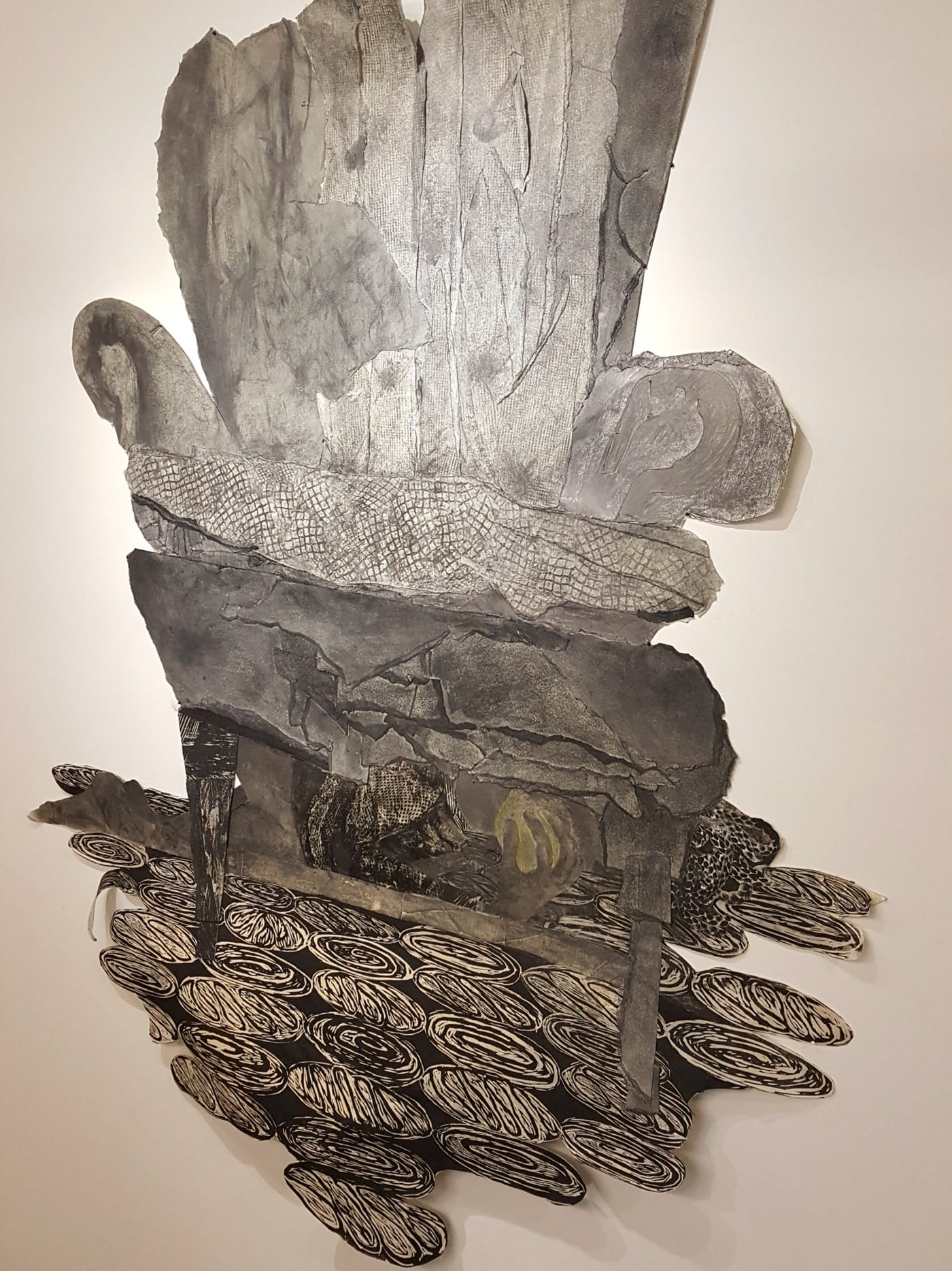 There are mixed media pieces by Simonette Quamina that look like monochromatic collages in tones of washy grays and umbers, such as in “Mango Eater” (2017), where the materials create small vignettes that exist somewhere between still lifes and stories. Eun Young (Lydia) Lee’s “131 Pieces” (2015) is an installation of small, overlapping photographic portraits held together with push pins. The color images are stacked so that they seem to create a single, snaking picture of the model’s naked body, turning from the frontal view of her face and breasts toward her backside, and then, with another turn, the front of her legs and feet. It is a static portrait that operates like a film reel, rendering the body in staccato glimpses.