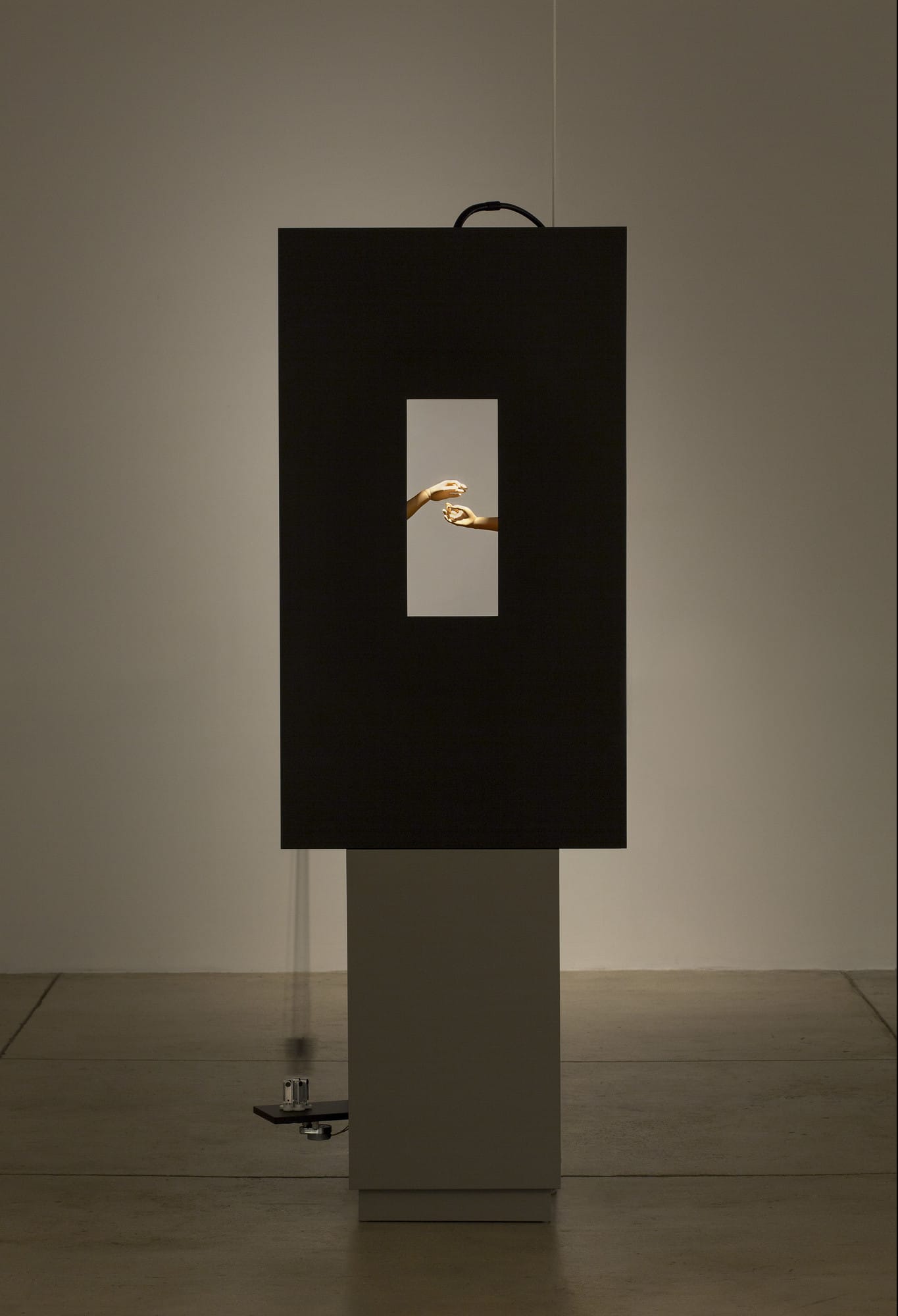On the opposite side of the gallery, past what looks like an abandoned movie set, this feeling of missed perception only magnifies with “Compass” (1999–2004), consisting of two small hands in a black box which obviously contains some sort of magnetic mechanism that should make them move. Staring at the hands for minutes on end, you find yourself wondering if the hands are moving or if the black box and magnets are all just a trick. Maybe staring at them long enough will make them move? It’s all about perception anyway, right? So does the movement itself even matter?