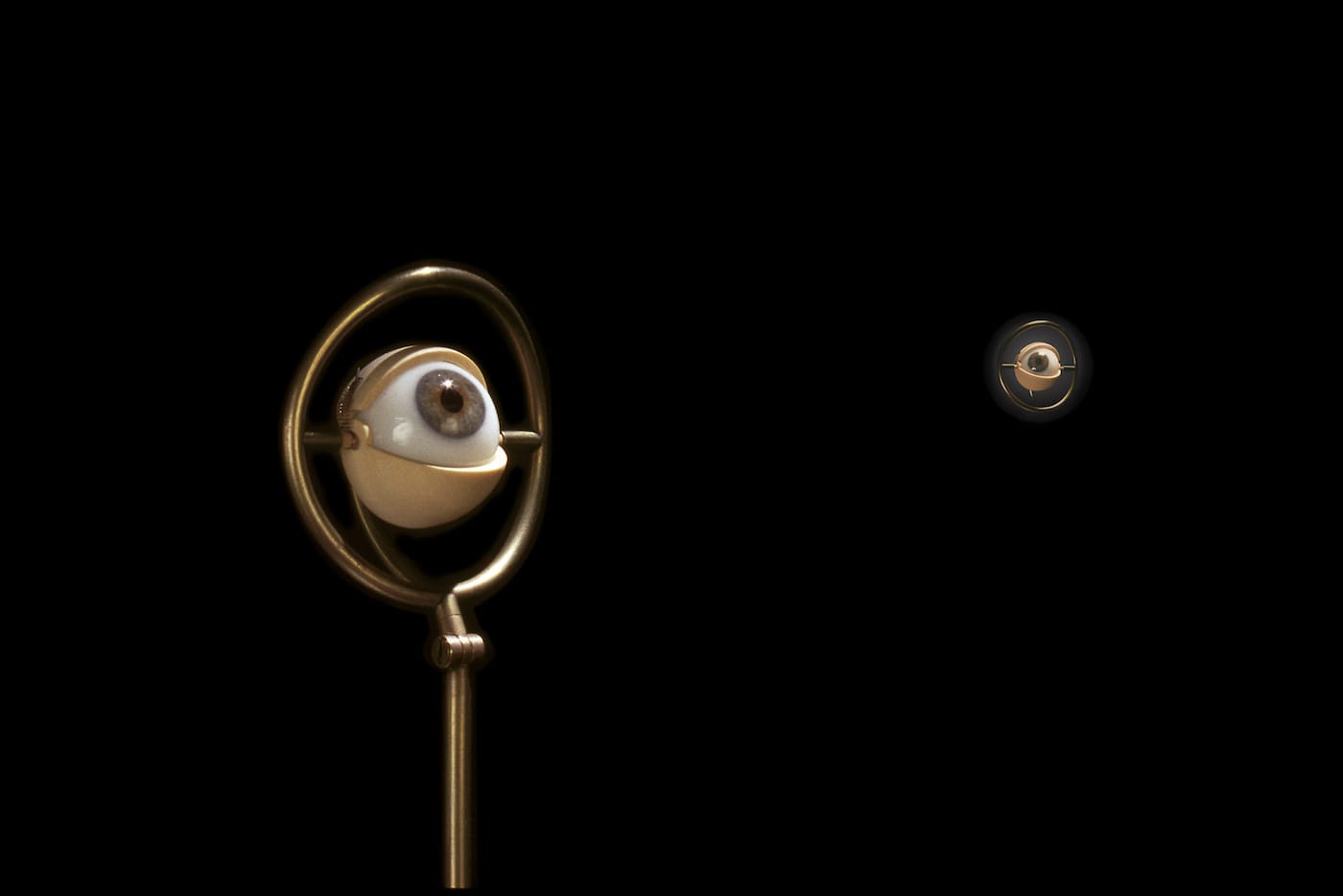 Walking up the stairs into the dark, vast gallery space, the first work that comes into view, “Idea for a Mechanical Eye” (1988–90), is a life-size, disembodied eyeball, complete with eyelids and held in place by a brass stand — making it look like a prop from a silent-era horror film. Behind it, a large projection of this same eyeball blinking slowly gives off the feeling that the sculpture may, in fact, blink of its own accord at any moment.