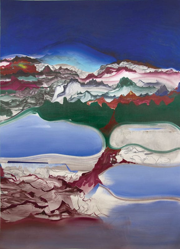 The paintings range in size from 18 by 24 inches to 77 by 137 inches. Their common subject is an uninhabited mountainous landscape in which pristine bodies of water nestle and smaller, self-contained landscapes and unnamable activities assert themselves. The climate is decidedly northern and mostly cloudless. The paintings stir up a host of associations, even as we recognize that we have not seen these places before: they are visions of an active world transformed into palpable skins of paint, in which a variety of greens and blues dominate, with violets, grays, yellows, and reds lodged throughout their panoramic views. What distinguishes these views from other landscapes is that Green’s paintings are essentially abstract; they approach the pictorial but never tilt over into that domain of quick legibility. We might start by finding equivalents but soon realize that is not what they are about.