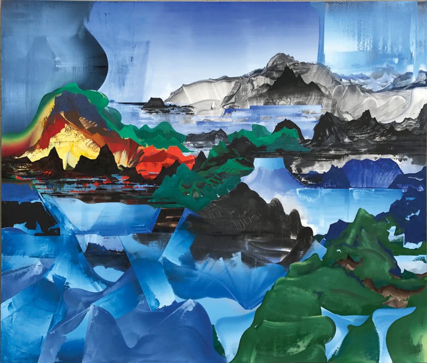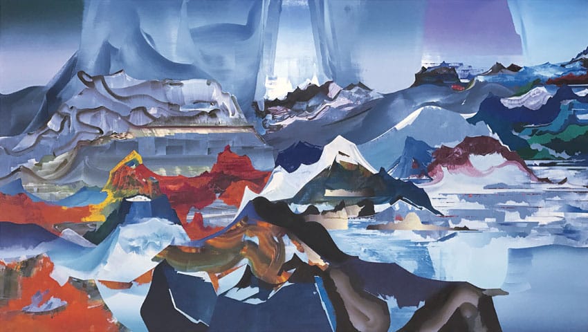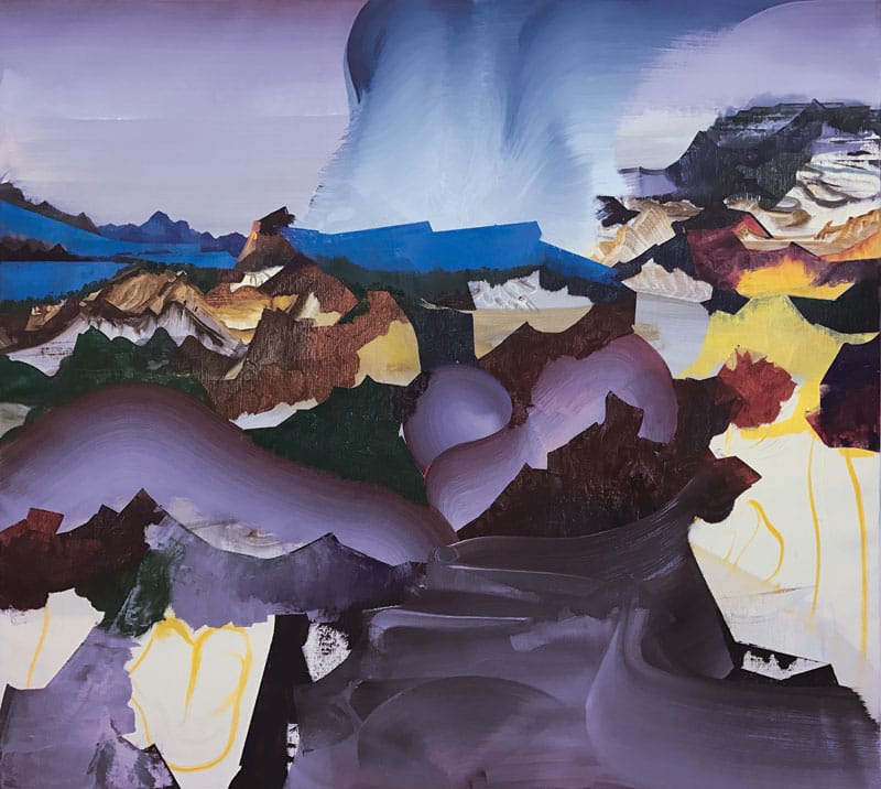 The twisting and folding layers of paint evoke a ceaseless magmatic churning, such as the continuously erupting Kilauea in Hawaii Volcanoes National Park. In fact, the island of Hawaii is probably the closest real-life equivalent to Green’s imagery, in that it encompasses four out of five major climate zones. Green seems to have compressed these major zones and numerous sub-zones into a single painting, such as “Fire Drip” (2016), with its sharp red peaks in the middle ground rising from behind rounded and quirkily shaped green forms. In “South of Nouth” (2017), the colors and shapes seem to incarnate a relative of the Aurora Borealis rising from behind a mountain.