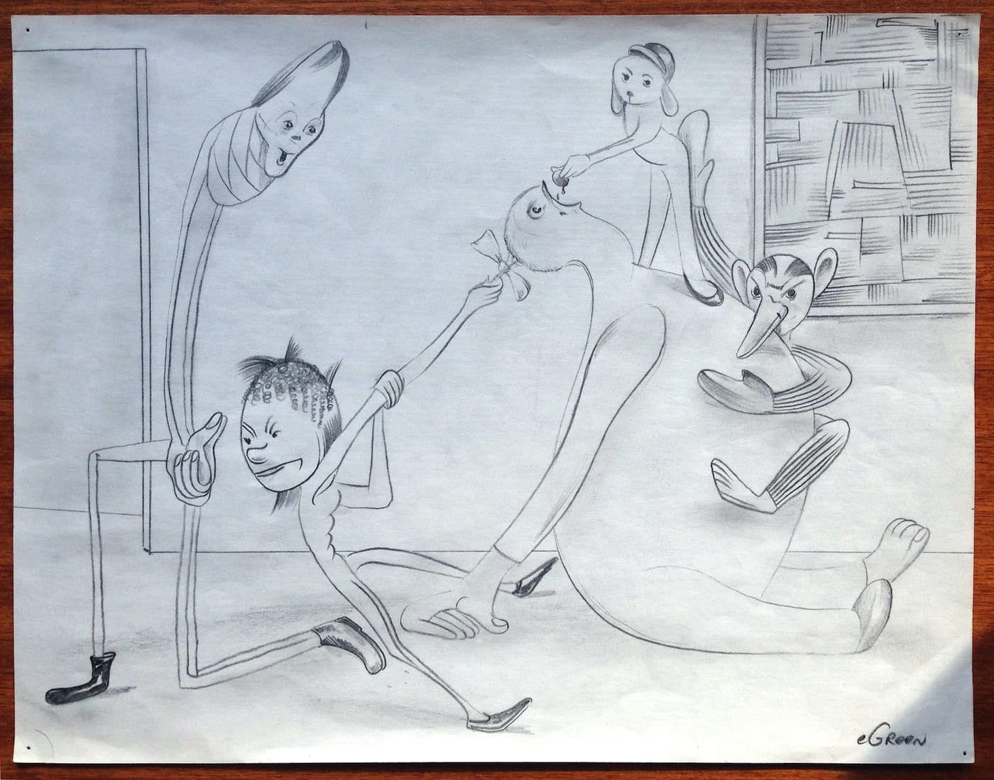 Greene did more than shift from abstraction to figuration or vice versa. In fact, I would not call it a stylistic change, but a complete revolution. In the earlier work, Green depicted cartoony figures engaged in a mysterious interaction. In the drawings, the figures emerged from a process of making and erasing lines. Over time, the figures, with their elongated appendages and oddly shaped bodies and heads began to become more abstract and organ-like, evocative of the late work of Arshile Gorky.