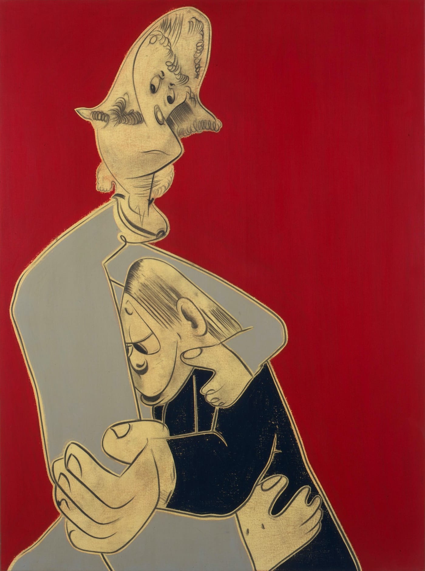 Green’s vision is humorous and disquieting. You never know what is motivating the figures’ high jinks. At the same time, there are moments of tenderness that never devolve into sentimentality or cliché. I am thinking of “Forgivable Kindness” (2000, alkyd and pencil on canvas, 40 x 30 inches).
