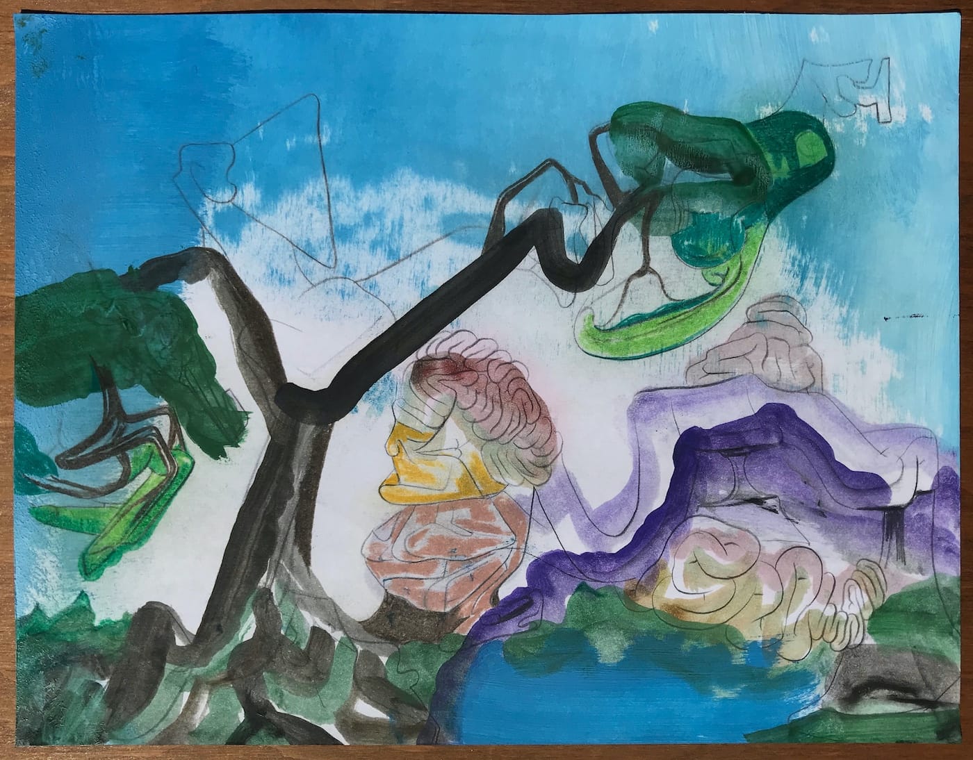 Green’s printing tools include a rubber comb, a drywall knife, and other unconventional ways of applying pressure to the paper. While the rubber comb can be used to imitate wood grain, it can also evoke graduated wave forms. By uniting organ-like forms and allusions to landscape, Green has again embarked in a new direction while engaging in a different way of applying material to a surface. Drawing, painting, and monotypes — each of these processes has led to a different body of work.