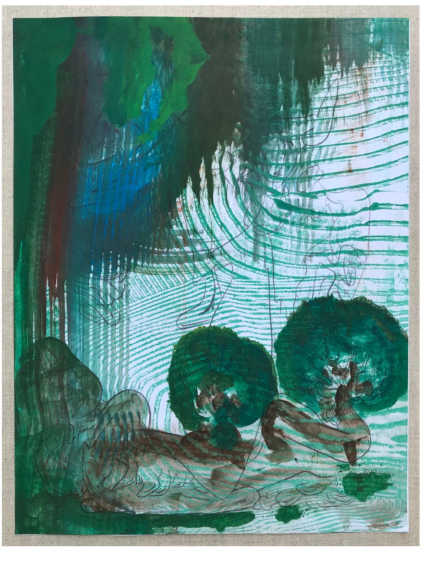 In the body of work currently underway in Green’s studio, the artist is printing over drawings dating from 2006. In these works, he seems to be trying to merge two parts of his practice — drawing and painting — through the use of printing. The drawing peeks through the layer of paint, as well as help define the forms we see.