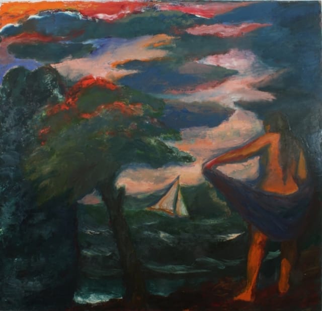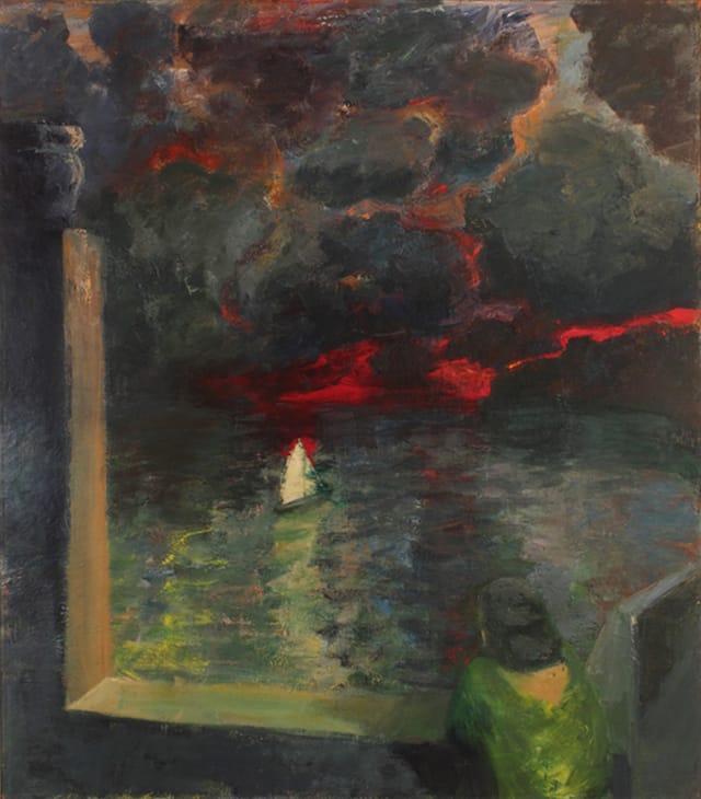 In the apocalyptic “Figure at Window with Boat” (1964), a woman leans on what I think is a parapet, looking down at a lone sailboat. The sky above is filled with oily black clouds edged in red. I could not help but feel that the painting was inflected by the feelings of unease, terror and fear that gripped America in the aftermath of the Cuban Missile Crisis, the white supremacist bombing of the 16th Street Baptist Church, both in 1962, and the assassination of John F. Kennedy in’63. Inspired by Albert Pinkham Ryder and paintings such as “Toilers of the Sea” (1880) and “Marine–Boat at Sea” (1893-94), what does the sailboat, which also shows up in “Figure, Boat, Clouds” (1971), symbolize?