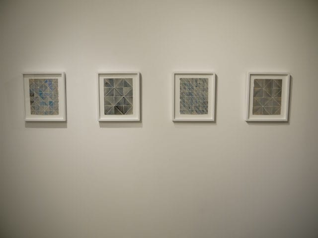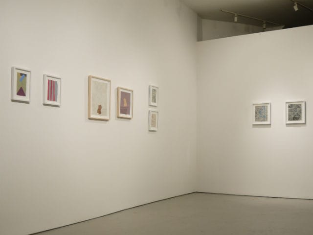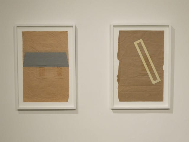 James Morrill, a co-founder of Rawson Projects who has known Berlow for over six years, pointed me to a suite of four works with a repeating pattern of blue triangles and drew my attention to the use of semi-transparent layers of wash. He called these new works “more painterly” in their search for new possibilities of form, gesture, and tone beyond the immediate qualities of his material. “This show really demonstrates that his practice is expanding,” Morrill said while we looked at a small work with a sliver of blue painter’s tape and wondered about the future possibility, perhaps, of collage.