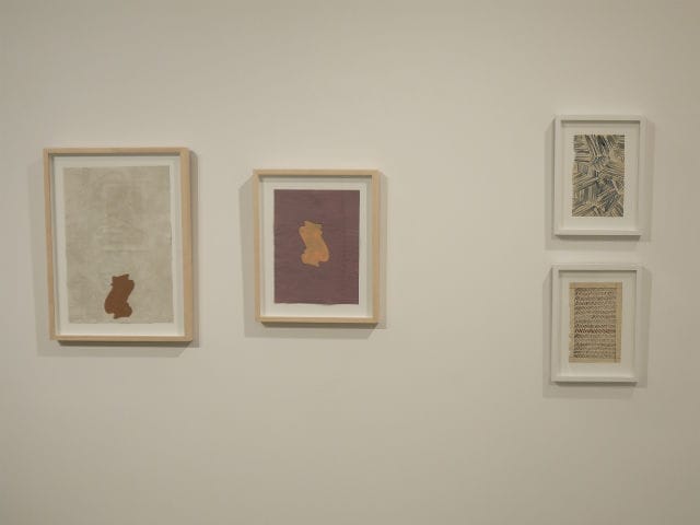 This new body of work, however, varies subtly from its predecessors in that Berlow begins to create forms and shapes independently from those already offered by the paper. In the interview included with the show’s press release, Berlow says that in making these, “I can’t remember what I was feeling or what I thought I was doing other than making a figure or shape that I wanted to look at.” For me, this was most visible in the first two pieces on the left gallery wall upon entry, in which Berlow traced rectangles into the corner and the center of two sheets of paper before filling them with free-flowing, curvilinear forms in a controlled palette of recurring colors. Another duo of drawings made on the reverse side of book pages feature hatches of thin ink lines in which the composition is built up around other marks on the page rather than the forms suggested by the page alone.