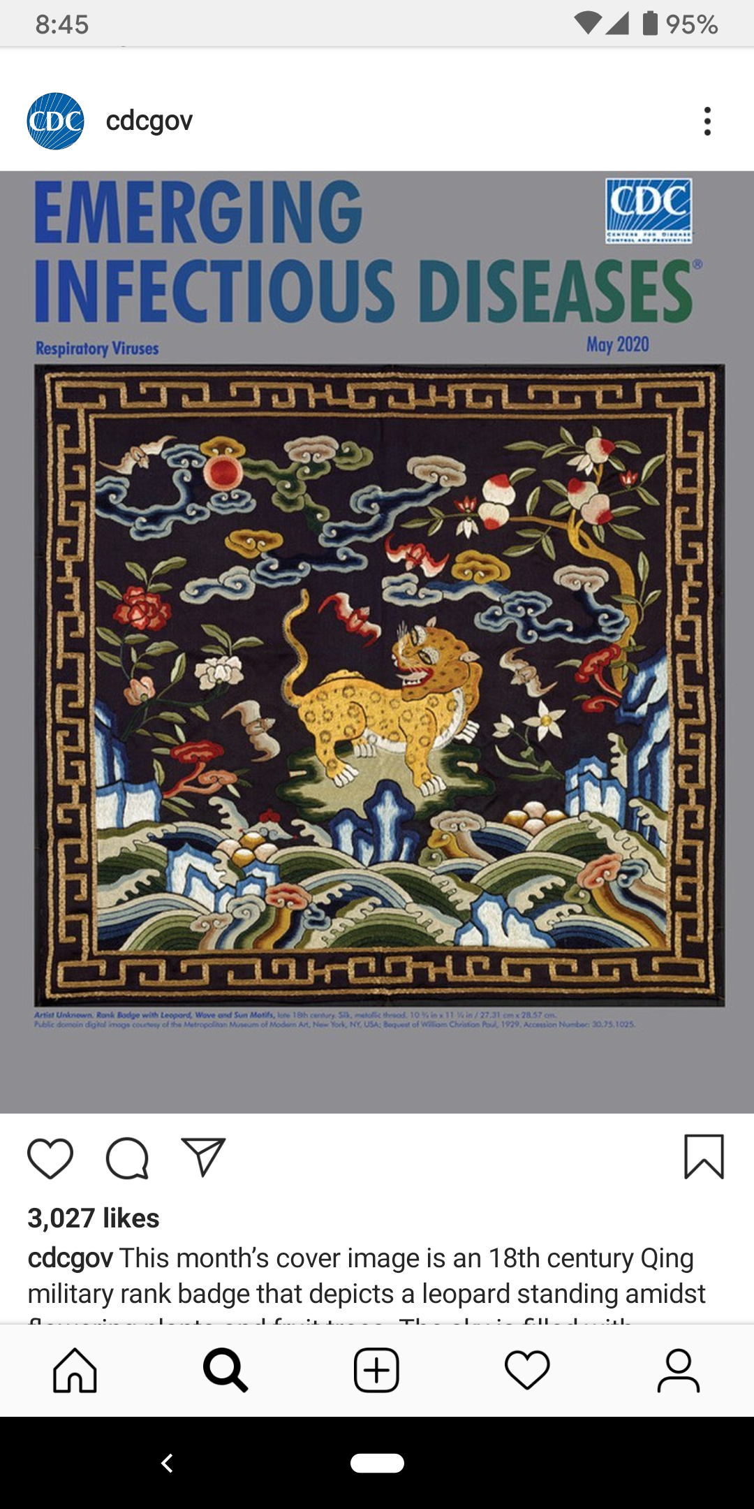 I had always assumed that the Centers for Disease Control and Prevention (CDC) was a voice that could be trusted to guide Americans through the present global pandemic, save for its flip-flopping position on the efficacy of wearing face masks in public. After all, I had shared the CDC’s safety guidelines concerning the novel coronavirus with students in my Asian art history classes before we made the transition to virtual learning. Instead, it was with a mixture of shock and disbelief that I saw my colleague Michele Matteini’s Facebook post about a Chinese textile gracing the cover of the May 2020 issue of the CDC’s Emerging Infectious Diseases journal. The cover image had been posted to the CDC’s Instagram feed and the comments section was flooded with expressions of outrage and concern at the inappropriate use of a Chinese work of art on the cover of a journal issue devoted to scholarly articles on COVID-19 and other respiratory infections. With this editorial decision, the CDC seemed to side with politicians and public figures, including our president, who have publicly characterized the novel coronavirus as the “Chinese” or “Wuhan” virus and by doing so, contribute to a recent wave of xenophobia directed against Asian-Americans.