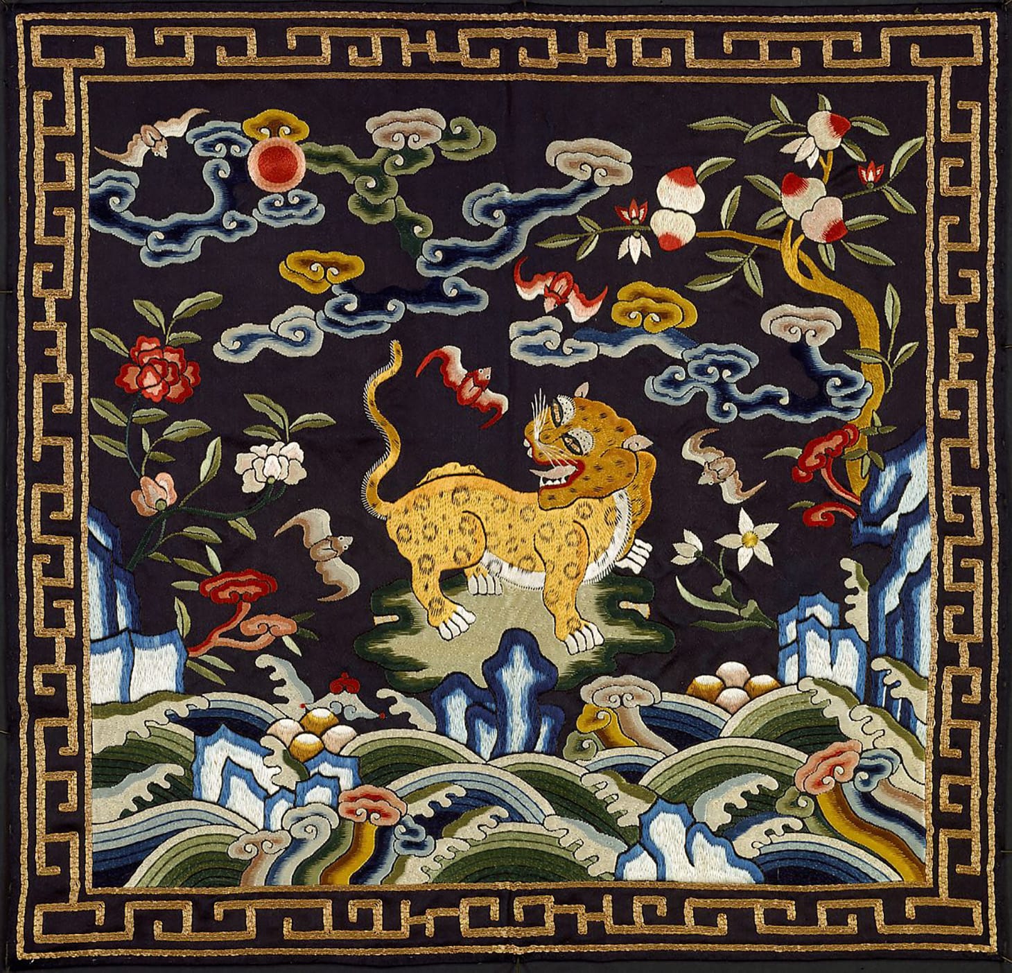 Rank Badge with Leopard, Wave and Sun Motifs, China, Qing dynasty (1644–1911), late 18th century, silk and metallic thread, Metropolitan Museum of Art, 30.75.1025