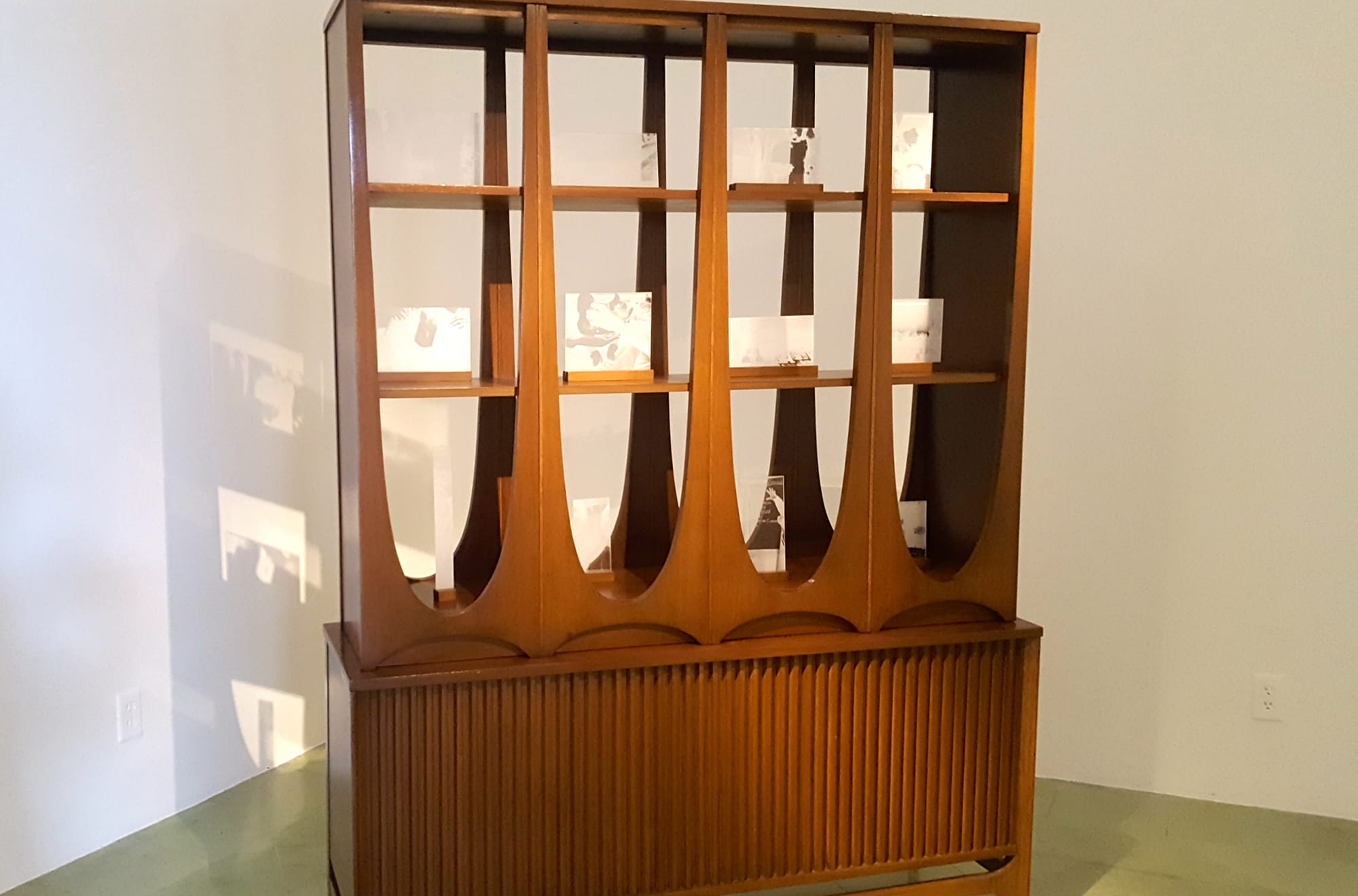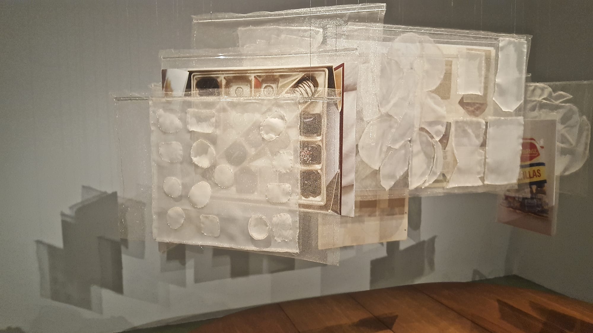 Sandoval is on a mission to recover what she has lost, presenting a spectral domestic ensemble, framed by midcentury furniture pieces — a display case, dining room set — that radiate a sense of use and history. Above the circular dining room table hangs an array of images from her mother’s old cookbooks, favorite dishes she prepared, and gifts of food offered to her in her decline. Overlaying and obscuring these images are sheaths of translucent white fabric, shot through with metallic thread. These are shrouds for the images, already an abstraction of the objects they represent, and like a shroud, they conceal and soften the blunt reality that without the animating spirit of the departed, objects and bodies are flattened husks. In another corner, the wooden display case frames images and objects replicated in etched glass — almost easier to see in the shadows they throw on the wall than in their physical form.
