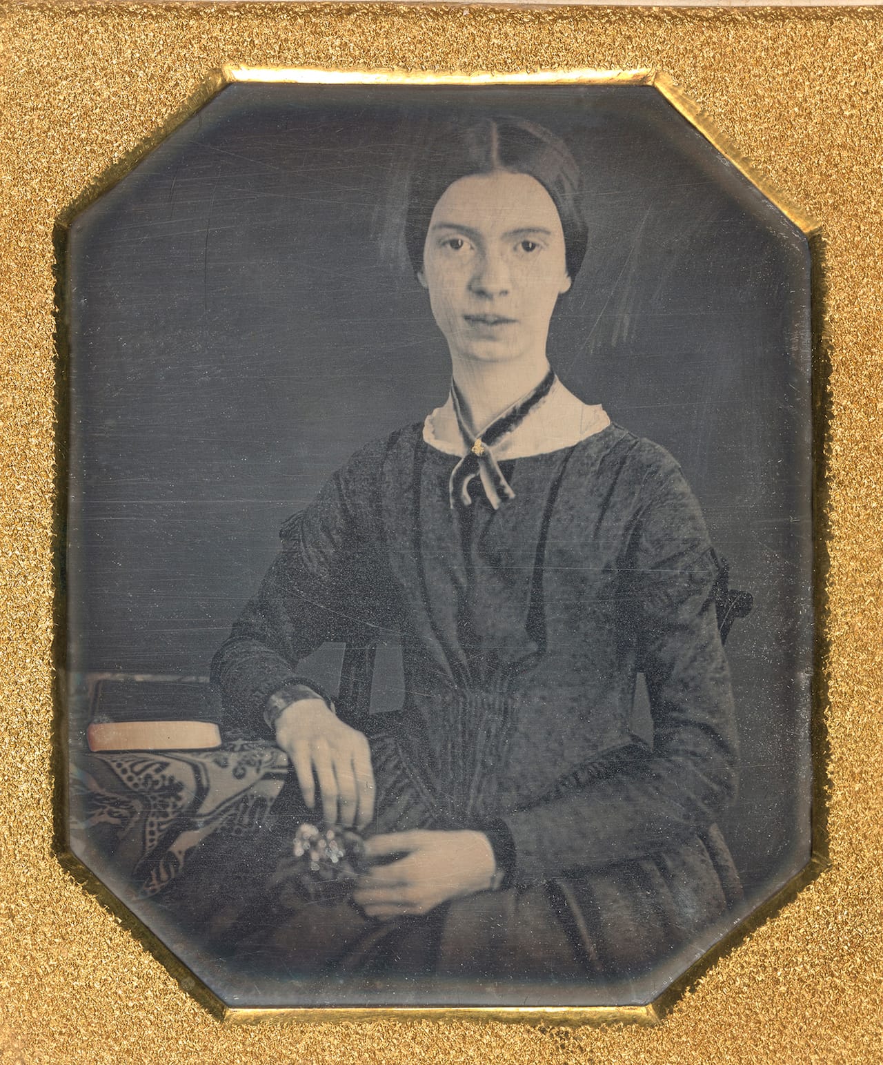 Only one authenticated photographic image of Dickinson survives, and it’s on view at the Morgan. The daguerreotype, which dates to around 1847, required the poet at age 16 to sit still for a long time as the image developed. Because it’s the only authenticated image, it’s taken on an outsized role in representing the poet. Its rigidity and stoicism, likely caused by the daguerreotype process — no one can smile forever — has perpetuated her image as Puritan recluse. Even her siblings complained it was “too solemn, too heavy and that it had none of the play of light and shade in Emily’s face.”
