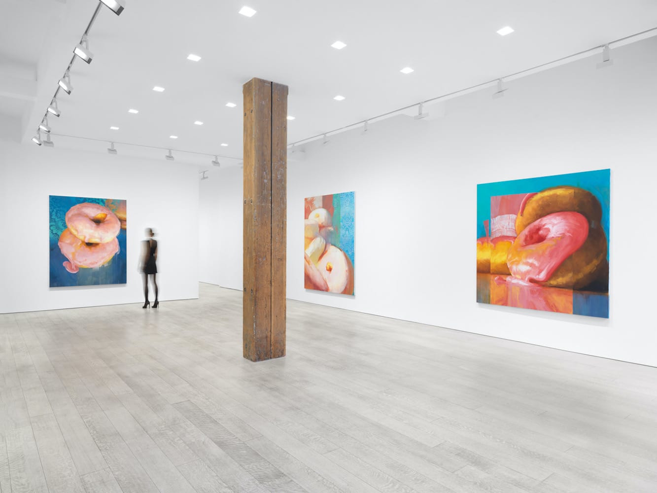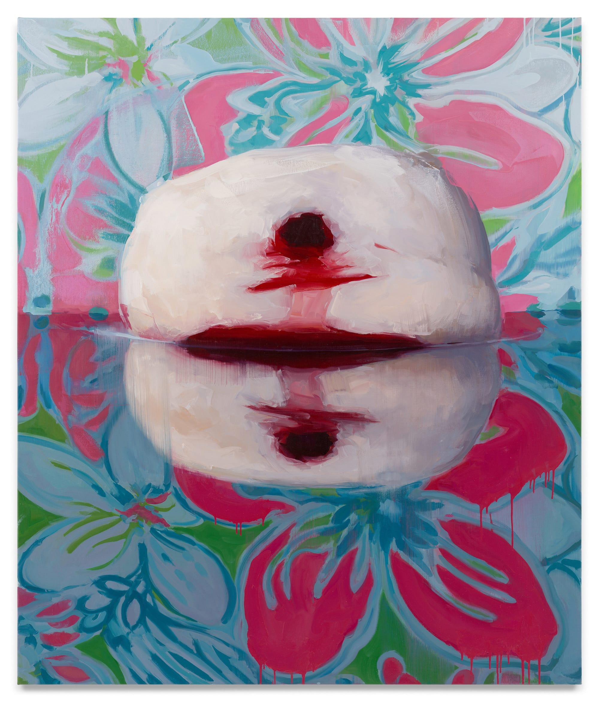 Eveleth’s paintings provoke wild associations. In her work, debauchery and decadence meet in the lowly doughnut, which we are invited to read as a limbless torso with a dripping orifice. These doughnuts bleed for our sins. In one case, it occurred to me that I was looking at the body of a beheaded swan, but more about that later.