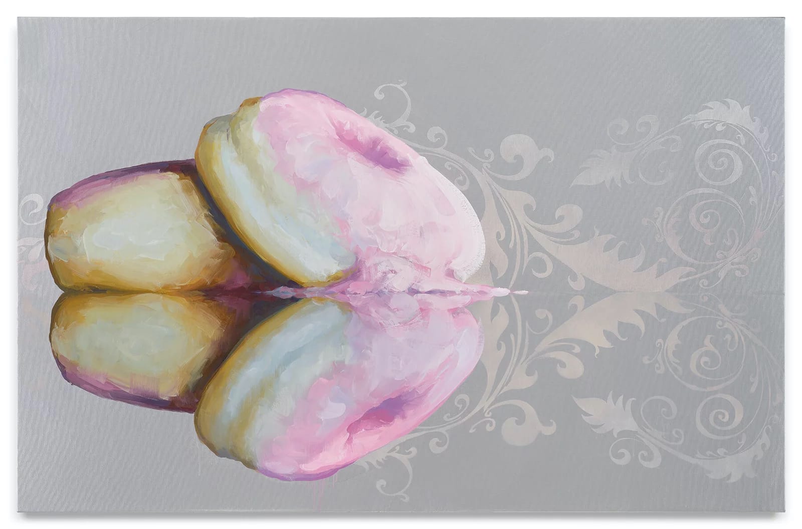 “Pompadour’s Dream” (2023) portrays a golden yellow doughnut covered with a thin layer of pink frosting. It rests atop its twin, whose pink coating has dripped down on one side, forming a puddle on a blue ground. Above the doughnuts we see part of a patterned blue satin pillow. Are the doughnuts lovers lying on each other? There is something ludicrous about “Pompadour’s Dream” and its suggestion of luxuriant indolence. The absurdity of the situation is lovingly and even tenderly depicted.