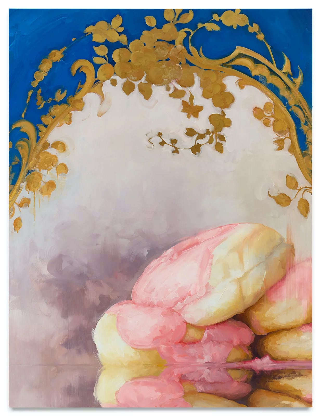 The exhibition’s largest work, “Storm Clouds” (2023), depicts four pink-frosted doughnuts slumped in a pile on a mirrored surface against a gray background. Some of the frosting has melted and accumulated on the reflective surface. Above the pile is an ornate golden archway of what I read as tarnished, cut metal leaves, branches, and fruit. Deep blue above the archway suggests either sky or wall. Where is this place? Is the painting intended as a still life? The setting does not add up. What is outside and what is inside? What is going on? And yet, it all makes perfect sense in a way, starting with the oversized doughnuts, which occupy nearly a quarter of the painting. Eveleth makes the preposterous almost ordinary.