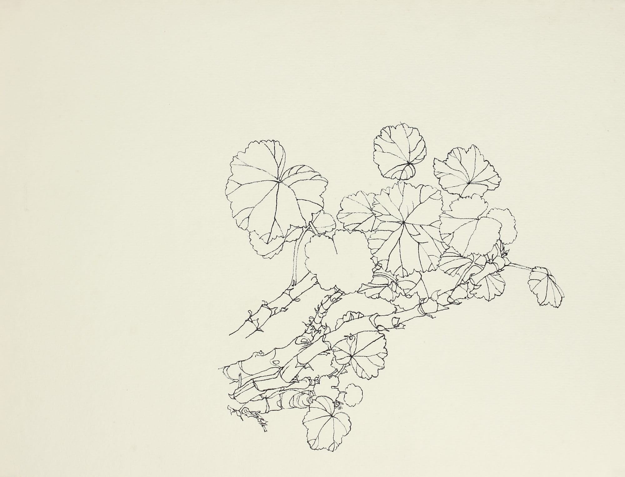 The specificity of her line drawings of individual plants contrasts with the abstraction of her landscapes. “Untitled” (1975), for instance, is one in a series of ink drawings of geranium plants. Leaves emerge from stems that are nearly bursting with nodes. While the viewer can barely differentiate one location from the next in her depictions of land masses, the veins of these leaves are clear enough to be maps.