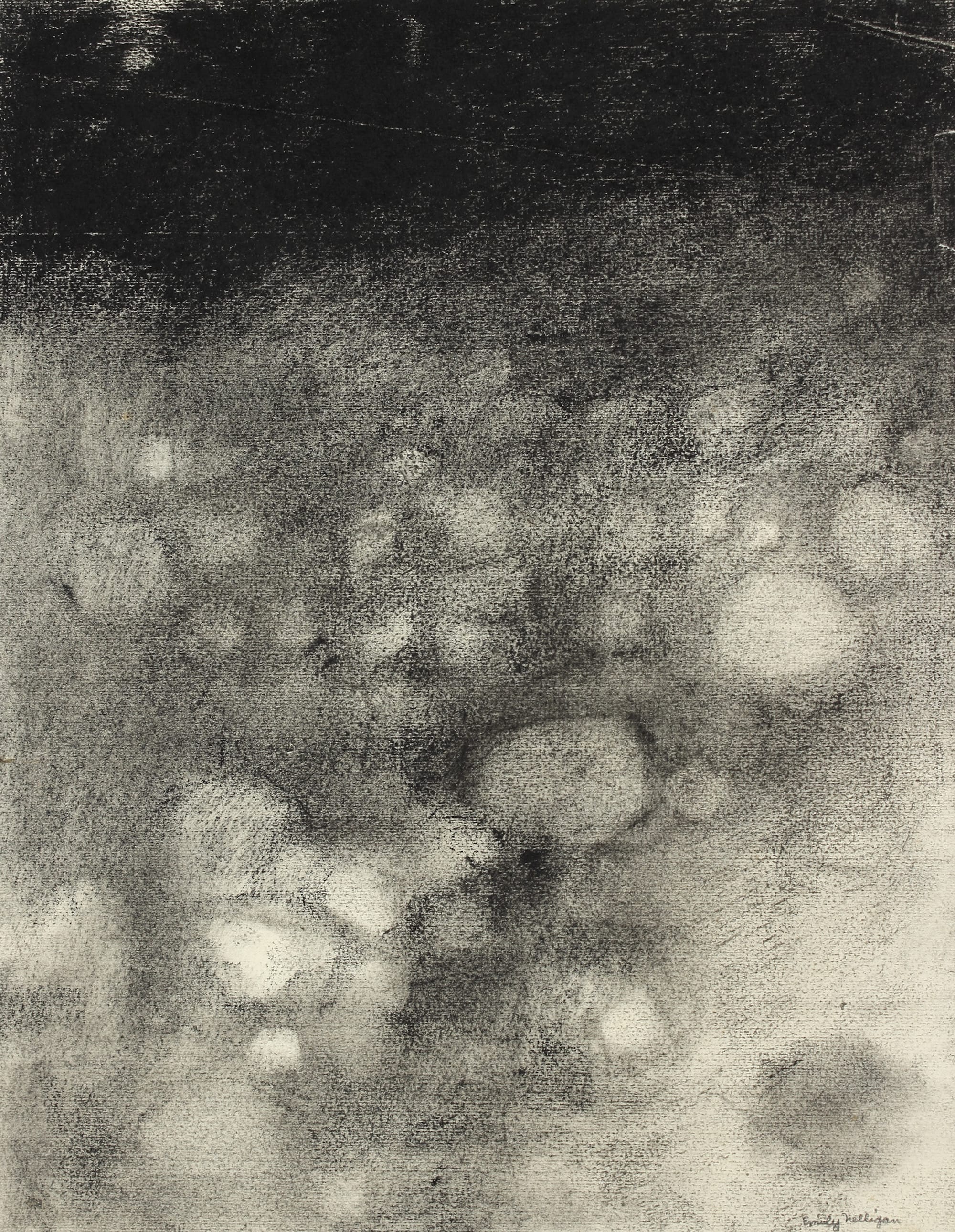 During the Paleozoic era, lava flows brought up mountains. Intense pressure crystallized the heavy layer of rock below the island’s surface. Glacial transit shucked the earth, creating the coves and valleys that form the Maine landscape. Nelligan worked in charcoal to save money, but her mastery of the medium’s tonal shifts in shades of gray created scenes that suggest the primordial beginnings of the land. She darkens the paper without weighing it with gloom. “1 September 62” (1962) is foregrounded by orbs shifting from rocks to bubbles in the viewer’s eye backdropped by a mass of vague pines. She found the ethereal in the ancient; her drawings swirl like metamorphic rock.