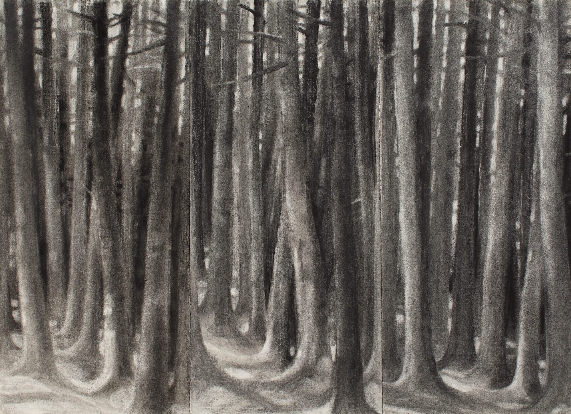 In charcoal and ink, the artist tends to the land with the intimate repetition of a life-long student.