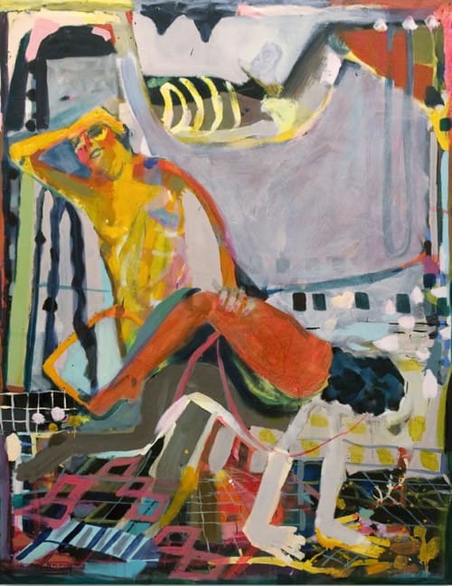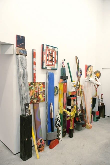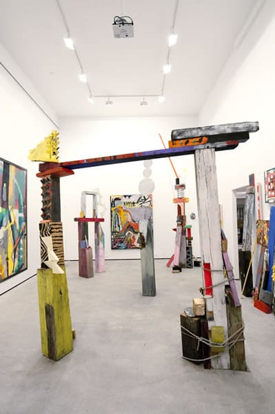 Sitting on one of Emily Noelle Lambert’s free-form, functional sculptures and surrounded by other found wood sculptures, huge canvases, and smaller paintings tucked around her Heart Heat exhibition at Lu Magnus, I had the distinct feeling that I entered into the artist’s personal world, a place where color, form, and balance skillfully link the two and three dimensional art objects all around. Given free reign of the Lu Magnus’s Lower East Side gallery space for two weeks prior to the opening of the exhibition, Lambert constructed almost all of the large sculptures on site.