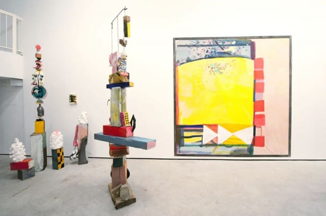 Creating large sculptures for the first time, Lambert first painted the wooden pieces in order to visualize how to construct the sculptures. Her sculptural color choices help to establish a relationship between her three dimensional work and her paintings. Standing at various places in the gallery, the viewer’s eye bounces across the room, noticing some of the same colors repeating elsewhere, allowing the viewing experience to become interactive.