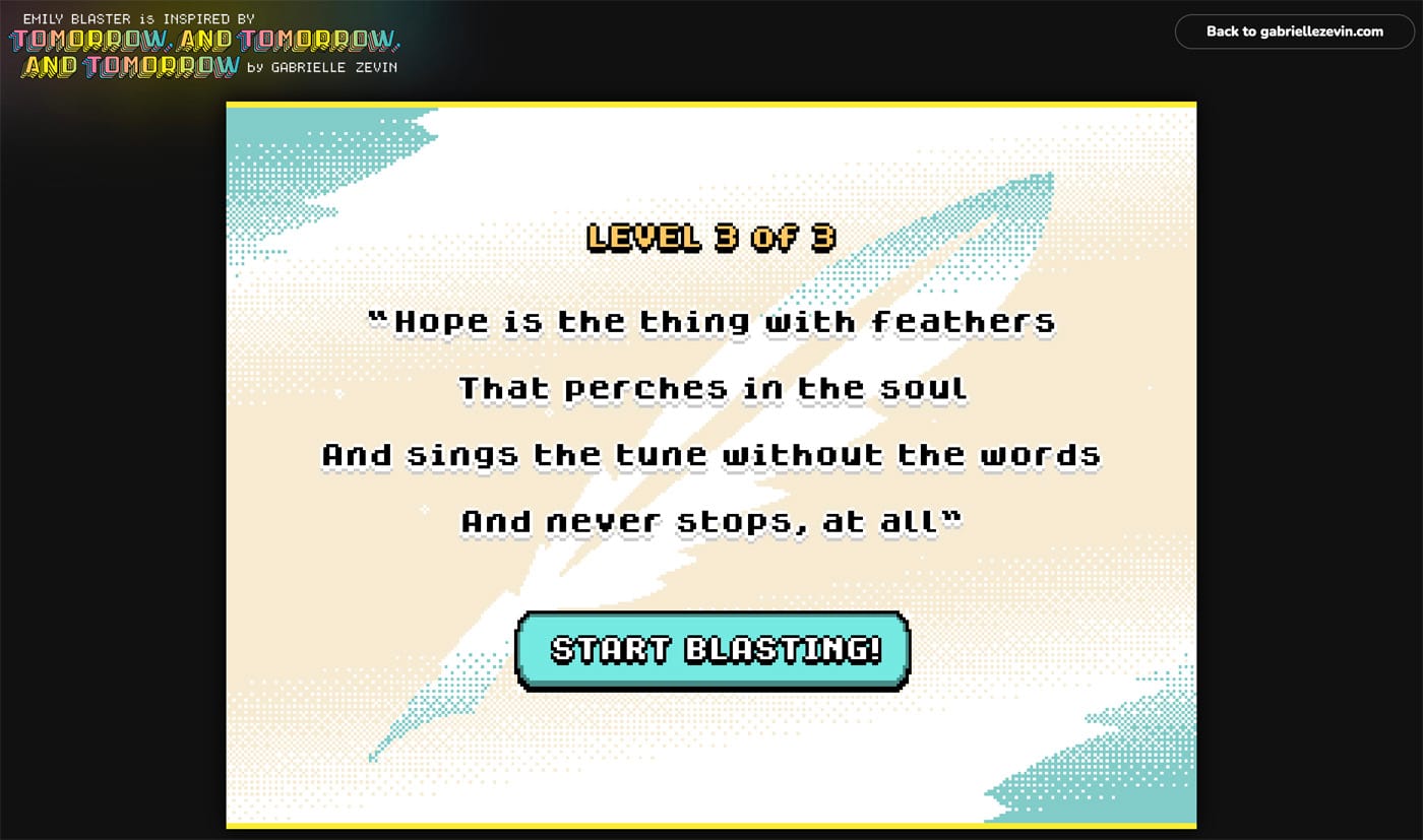 “I liked the slight subversiveness of making a game where the object was to shoot poetry, and I thought that Emily Dickinson’s compact verse style and memorable phrasings would make for perfect targets,” Zevin told Literary Hub. Each level offers a verse as a prompt and leaves the player to attempt to reconstruct it in the game field from memory. Dickinson’s poem 'That Love Is All There Is," for example, is featured in the first level of EmilyBlaster, and it also provides the epigraph for the novel.