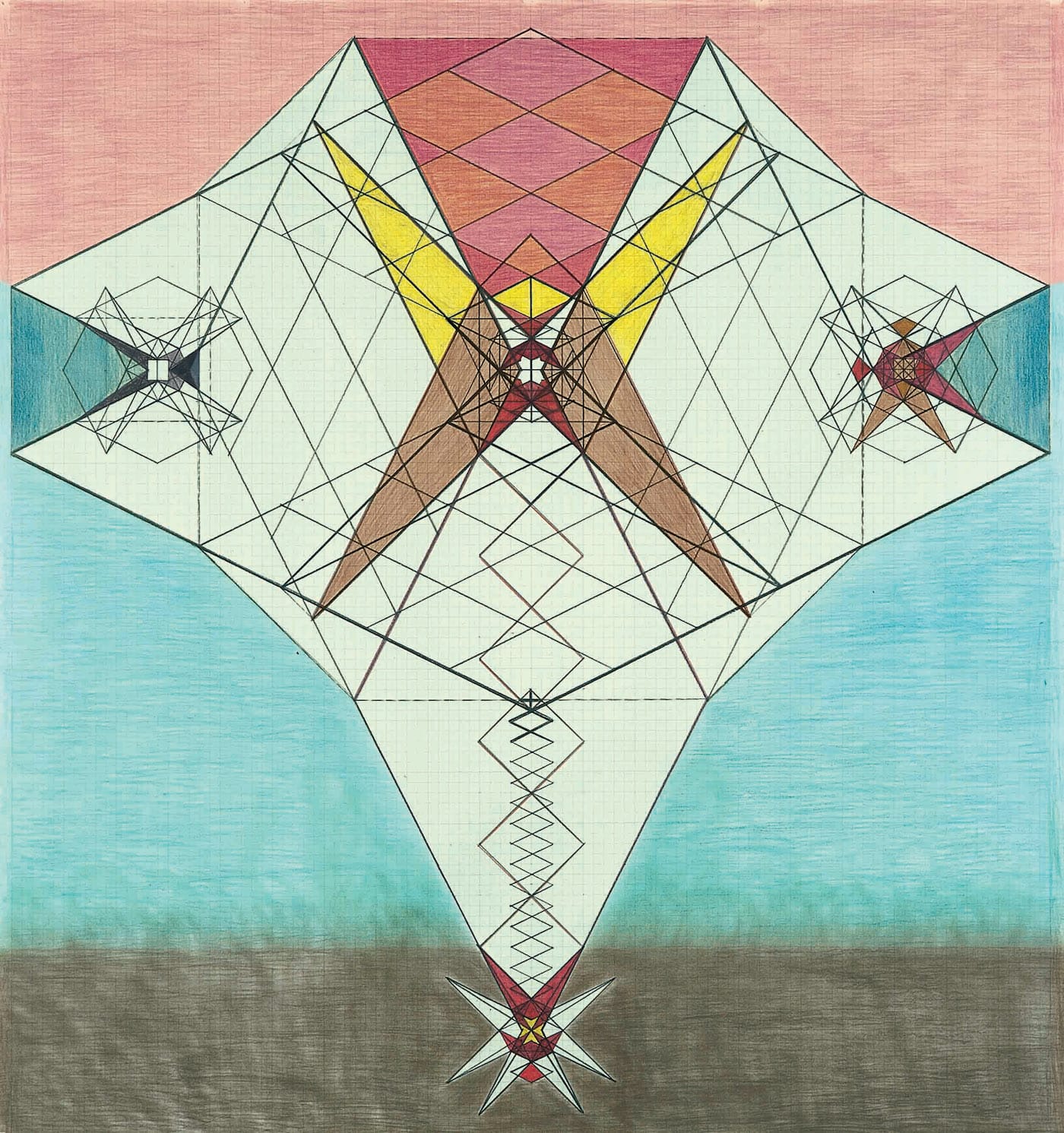 Just over 40 drawings are displayed in the show, which constitutes a small portion of Kunz’s legacy. Although she didn’t incorporate art-making into her spiritual practice until her forties, she managed to produce hundreds of works. Each one acts as a portal between the earthly realm and the transcendent realm. Spreading out on checkered sheets of graph paper, these “energy field” drawings have an intricate but technical look to them. They were made with a technique called radiesthesia, in which the artist used a divining pendulum to plot the compositions. At times, Kunz would work on them continuously for almost 24 hours, and she considered them to have the potential to give different readings at different times.