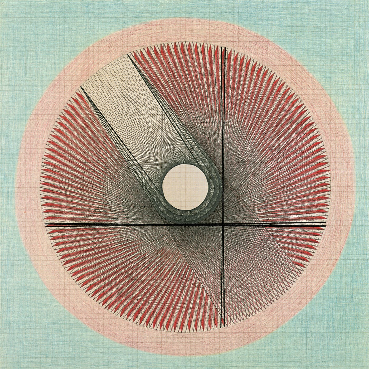 Around the outbreak of the Second World War, Kunz made a drawing, “No. 20”: dozens of red rays fanned in a circle, intersected by two sets of thick black lines. While creating the work, Kunz asked her pendulum about the future of world affairs and outcomes of political negotiations. According to her contemporaries, she predicted that the US would develop a weapon with the potential to destroy the world — a prediction often thought to be related to the atomic bombs detonated in Japan in 1945.