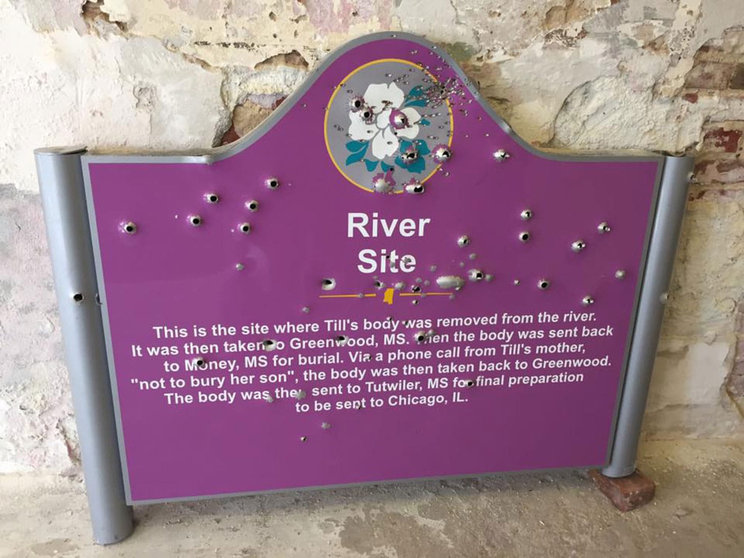 A sign in memoriam of the late Emmett Till was vandalized only weeks after it was erected on June 21, 2018. This makes it the third sign vandalized in a series of efforts made by the Emmett Till Memorial Commission to commemorate the youth’s death. The sign, installed on the bank of the river in Tallahatchie County, Mississippi where Till’s body was thrown after his death, was shot with four bullets on July 21. The Commission, after consulting scholars and the Emmett Till Justice Campaign, has agreed the defaced sign should remain standing as is.