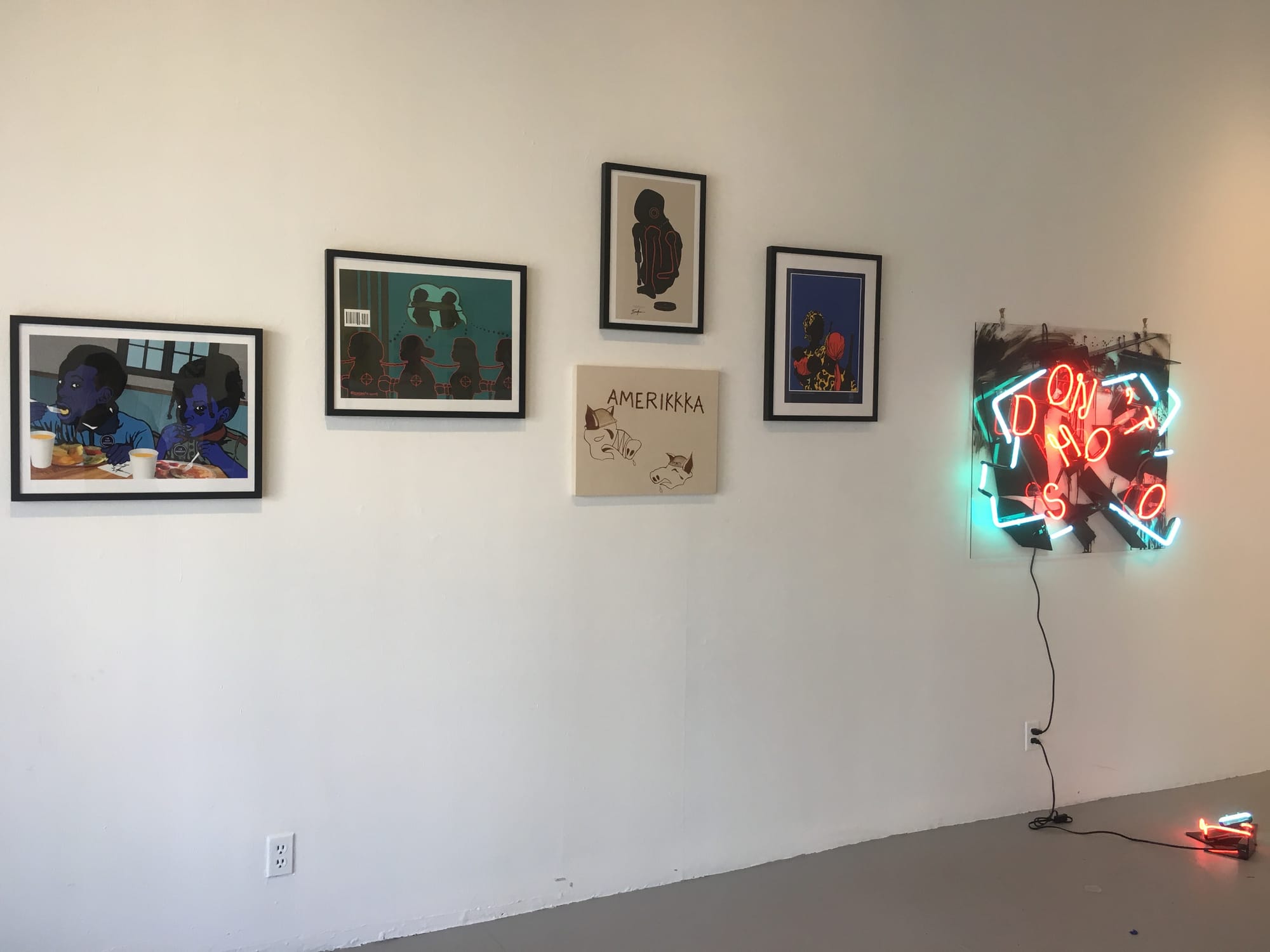 Douglas’s new works, shown alongside pieces by younger artists, draw a line of influence between the two generations, but, for their part, the curators seem to be establishing a community of shared concerns more than an art historical genealogy. The strategy effects a greater sense of reciprocity between the artworks, on a broader range of issues. For example, neon sign with a shard on the floor by Patrick Martinez, “Hands Up” (2018), reads “Don’t Shoot” in scattered lettering that recalls a broken glass window, while recent prints by Douglas address the victims of food shortages — most often, people of color — at home and abroad. (LACE’s location on the Hollywood Walk of Fame is fortuitous, as it brings in viewers who may otherwise never enter a museum, let alone a socially conscious art nonprofit.)