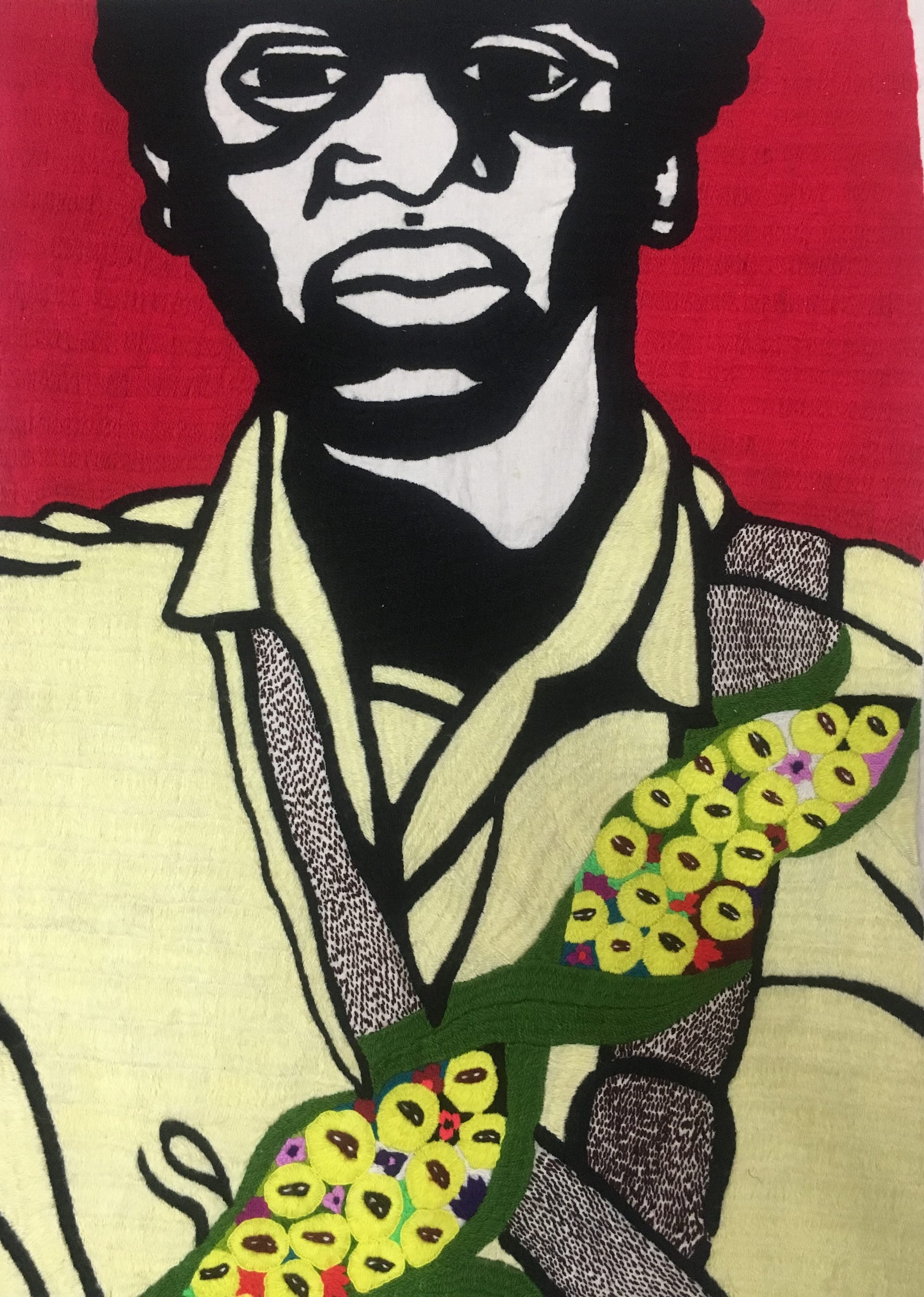 This sense of solidarity remains evident in Zapantera Negra (2012 – 16), a recent collaborative project Douglas undertook in Chiapas, Mexico, with the Woman’s Zapatista Embroidery Collective and Caleb Duarte. For these tapestries, hung in a circle from the ceiling near the center of the room, well-known Douglas images (including the above-mentioned woman with a spear) are reworked to speak to a different and expanded demographic.