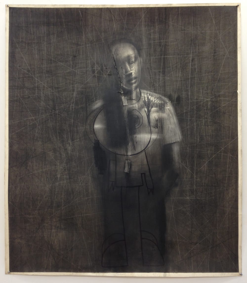 The exhibition is composed entirely of drawings from the late 1980s and early 1990s, which the artist made by laying down a solid ground of dense, black charcoal and then roughing out his forms with an eraser.