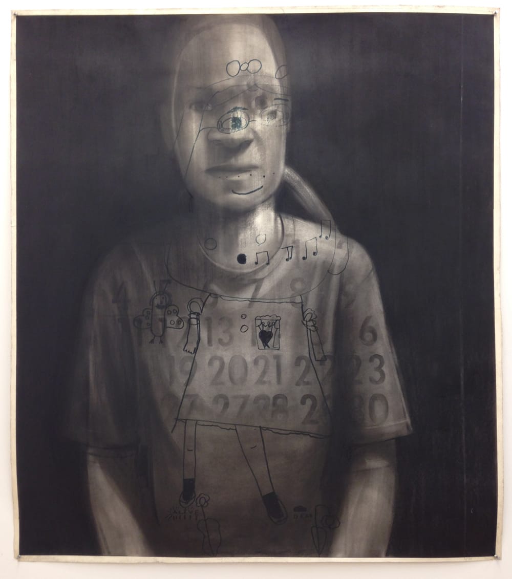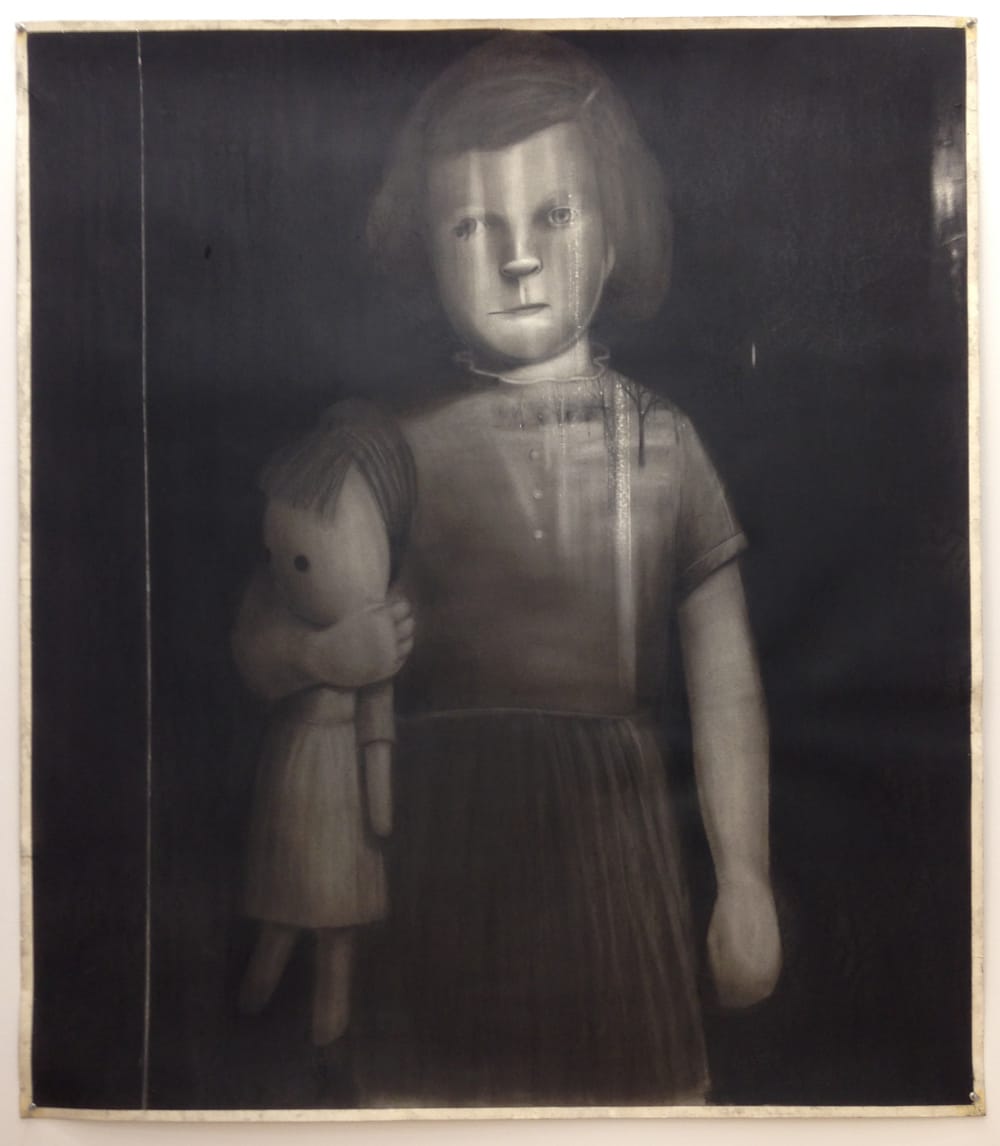 It’s an unsentimental portrait, to say the least. The unsmiling girl stares straight at you, the mutant-looking rag doll under her right arm shrouded in shadow. Only after you break the grip of her gaze do you notice the streaks and abrasions marring the drawing’s surface and the landscape that’s mysteriously etched onto her left shoulder.
