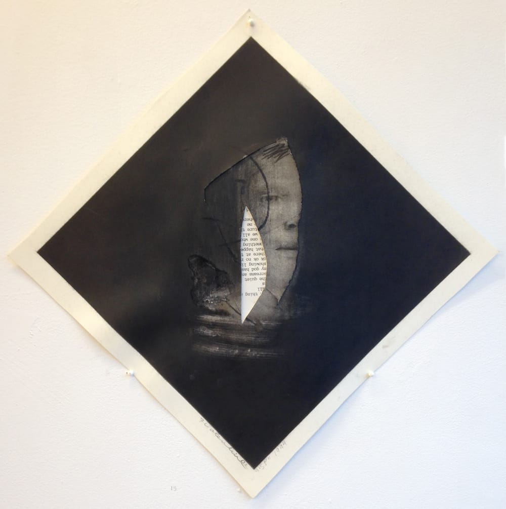 In some of the works, including the searing “KG,” the surface is sliced away and another sheet of paper containing a face — or, in one instance, text (the diamond-shaped “SP,” 1994) — is pasted into the empty space beneath. The inserted portion doesn’t jibe in scale or tone with what’s left of the original portrait. Straddling classicism and collage, this pictorial fragmentation, fused as it is with the paper’s fragmentation, turns the work into a collision of Cubism, Surrealism, and Chicago Imagism, but with a humanity that undercuts the cerebration and irony permeating those styles.