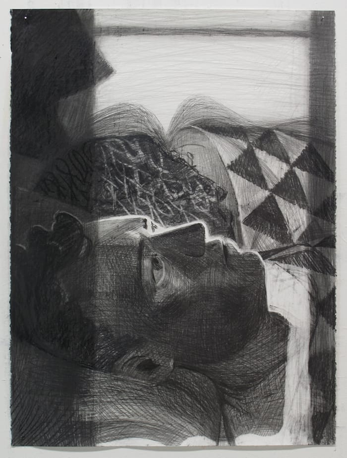 In a small gallery — and literally it was the last work I came to — there was a charcoal and graphite drawing, “4 AM (2016), of a man lying in bed, wide awake, while next to him, and turned away, his companion lies asleep. The sweet melancholy of this drawing is present everywhere in this deeply moving exhibition.