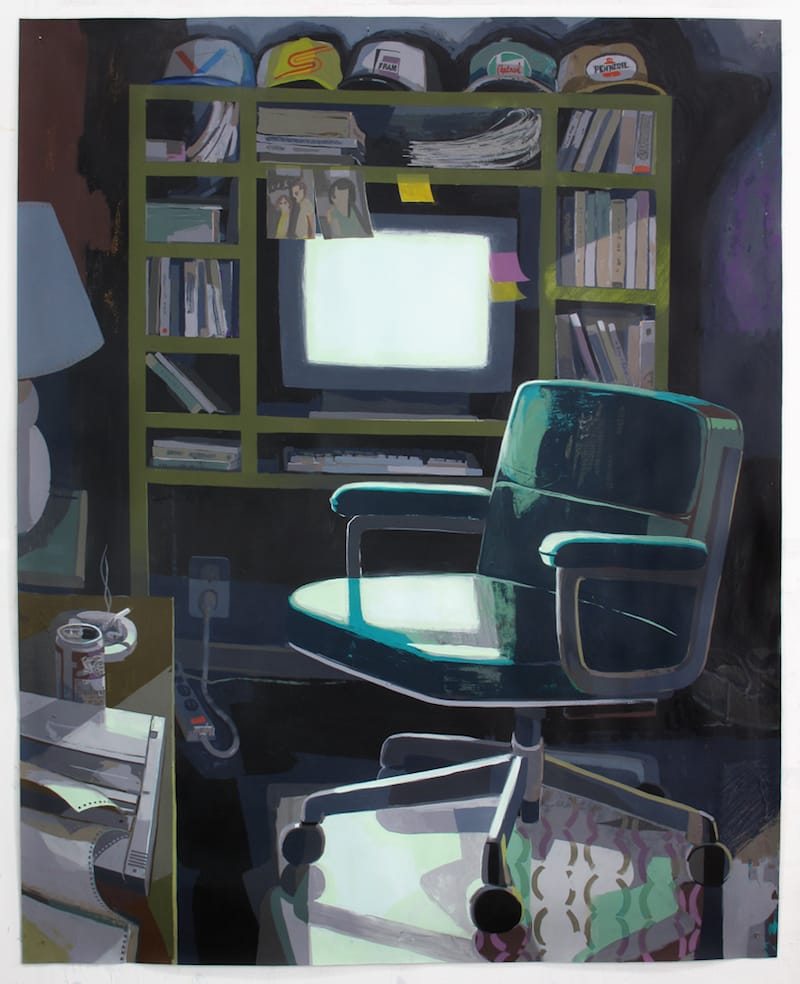 In a related painting, “Dad’s Home Office” (2016), which is done in Flashe and acrylic on paper, and pinned to the wall, Bollinger depicts a computer screen casting its light on a green rolling office chair and, in the foreground, part of a desk cluttered with an old-fashioned dot-matrix printer, a can of Budweiser, and an ashtray, a cigarette still burning in it. Whoever was sitting in the chair has left but will likely be back soon. Bollinger’s attention to detail — such as the row of baseball caps, with their distinctive logos, on the top shelf of the crammed home office desk, its shelves filled with manuals and papers — is what makes Bollinger’s paintings stand out. His affection for the mundane is evident in such details as the pink and yellow Post-it notes stuck to the bulky desktop computer and the glowing red switch on the four-outlet surge protector, a talent for observation matched by his sensitivity to color and light as well as by his handling of space.