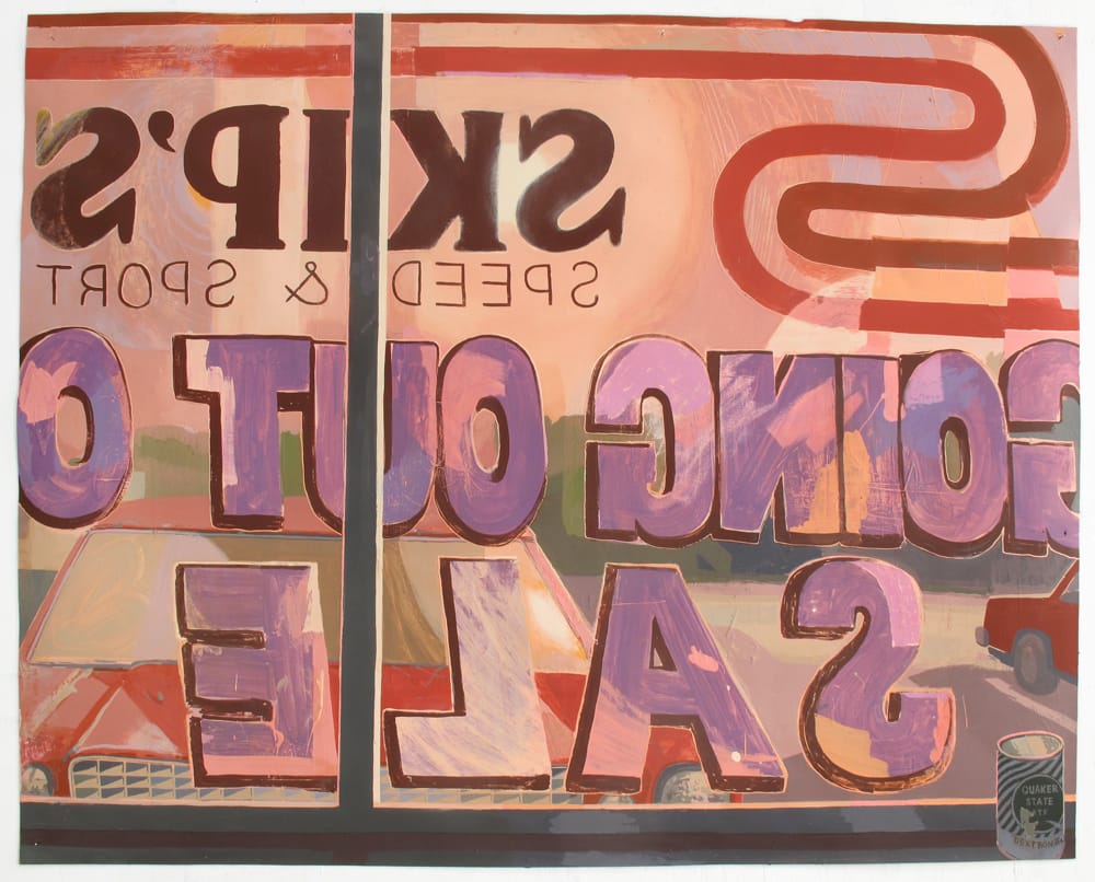 Chain link fences and windows — signs of limited physical access and separation — are recurring visual motifs. In “Morning After” (2016), which is done in Flashe and acrylic on paper, Bollinger depicts a portion of his father’s store window, with its logo and the words “Going Out” written backwards. Visible through the window, there are two cars in the parking lot, and both of them are red. It is early in the morning and everything has changed.