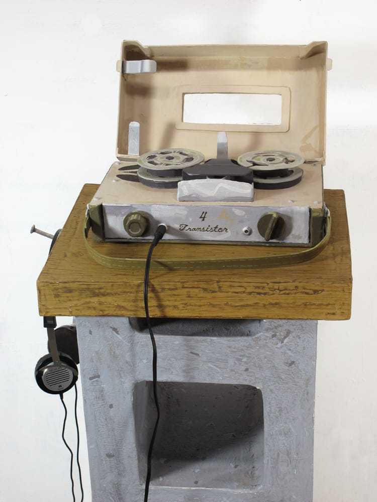 There is a lo-fi feeling to the work that is in keeping with the subject matter. In “Reel by Reel” (2016), the artist has used matte board, paper and other common art materials to make a tape recorder (ca. 1975), with headphones and a digital sound system. The latest technology meets the old and obsolete, resulting in a recorded interview that the artist conducted with his father about his business, a car parts store that he had to close after failing to compete with large chains, and run out of the family garage.