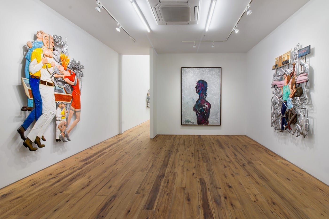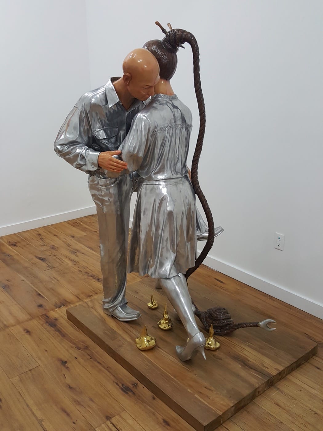 Though there are several other pieces in Wiharso’s solo exhibition Promising Land, including the frieze-type sculptures he has become known for, they don’t interest me nearly as much as the semi-narrative tableaux depicted in “Double Protection” and echoed by “Golden Sweat” (2014–16). The latter more obviously partakes of the language of surrealism articulated in Wiharso’s other sculptures, which also have the color and cartoonish hyperbole of pop art. In “Golden Sweat,” the figures are standing, again close together, all dressed in silver. The woman holds a shotgun in one hand, its butt on the floor behind the man. As with “Double Protection,” the expressions on these characters’ faces are devoid of emotion, their eyes given over to thousand-yard stares into the ether. Here again there are paired knives in the woman’s hair, which is sculpted into a long tendril that pools behind her to end in a kind of crescent-shaped weapon. Small gold tear-shaped ingots are plopped on the floor beneath the figures. They might be dancing; they might be plotting murder.