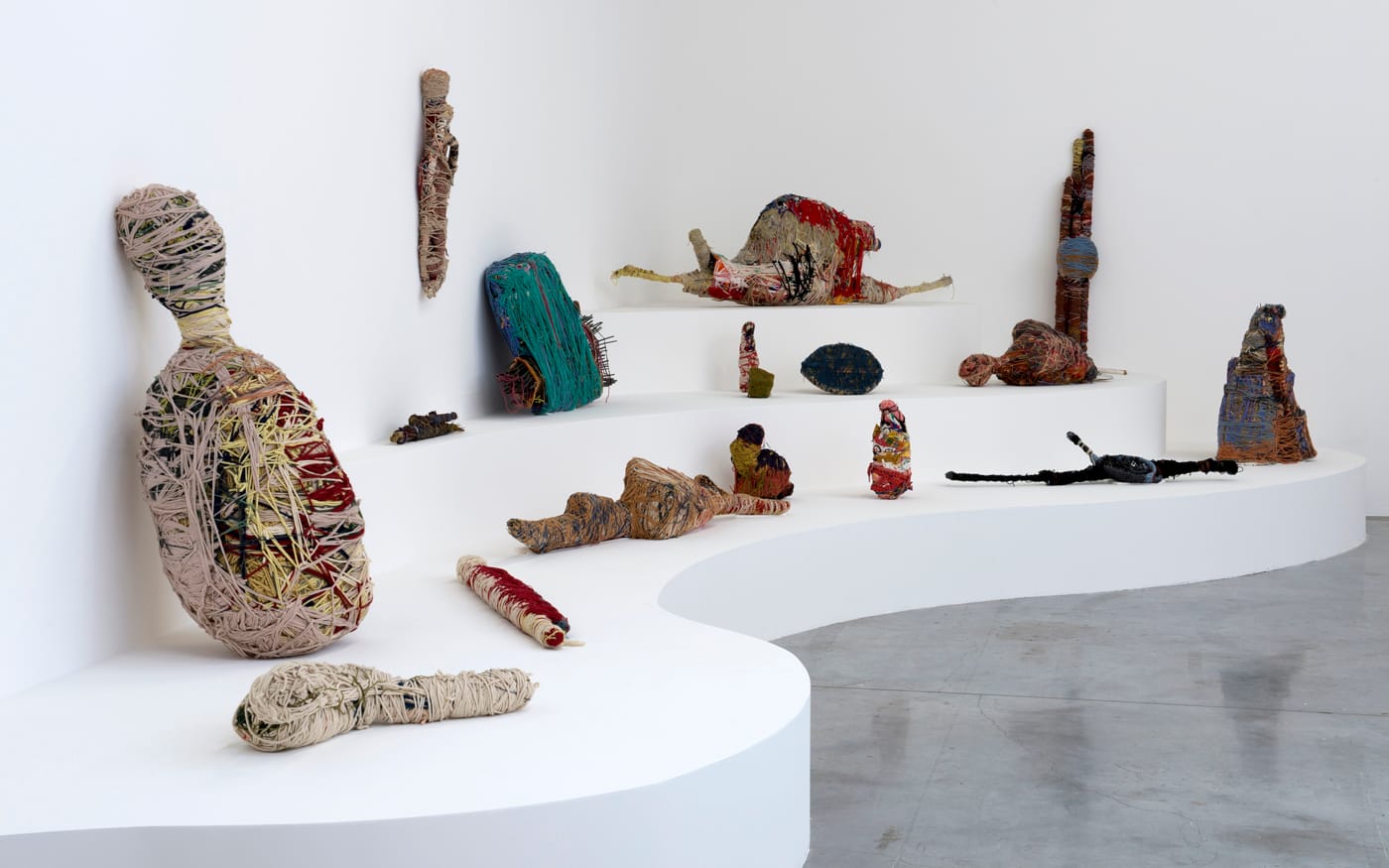 Prominently featured are the mysterious string sculptures by Judith Scott, who suffered from Down syndrome. Institutionalized since 1950, Scott saw a fiber art class being conducted by visiting artist Sylvia Seventy and began making anthropomorphic and zoomorphic sculptures that resemble cocooned body parts and elongated totemic poles. She began these by recovering (sometimes stealing) all kinds of miscellaneous objects, like umbrellas and bicycle wheels, using these thief’s treasures as the hidden core of her powerful sculptures.