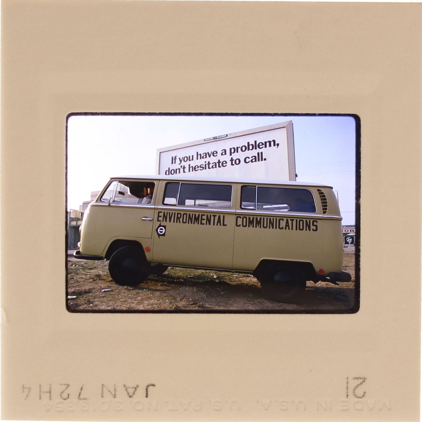 The number of people involved in Environmental Communications changed throughout its decade-long existence, but the curators have identified at least over two dozen of its members. Its primary leaders were Roger Webster, whose name appears on a number of the slides, Bernard Perloff, David Greenberg, and Ted Tokio Tanaka. Working in the same spirit as experimental media collectives active at the time like Ant Farm, Environmental Communications engaged with their surroundings with an air of performance: photographing cities to create academic resources was an artistic production, but so were the administrative deeds of dealing with orders from institutions and shipping out catalogues.