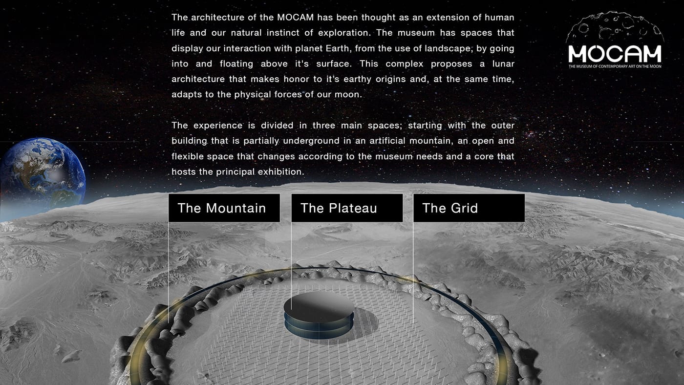 JO: We can say with certainty that the moon has always been a center of reverence for human beings. The first depiction of the moon was discovered to be a 5,000-year-old stone carving in Knowth, Ireland. The Museum of Contemporary Art on the Moon was designed to think about the real possibilities of constructing physical space on the moon, as designed by the architect Mauricio Mastropiero. He dedicated a lot of time on the project and we both discussed after extensive research what would be the most realistic options of said space. This is not the first architectonic proposal for the moon, but it may be the first one creating a venue in regards to the display of art.