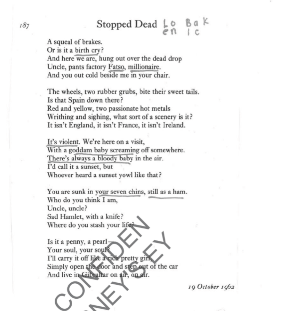 On a page of the apparent journal, the diary’s author pasted a copy of Sylvia Plath’s 1962 poem “Stopped Dead” and added “Leon Black” in handwriting next to the title. The author underlined several lines from the poem: “birth, cry, fatso millionaire, it's violent, goddamn baby screaming, there's always a bloody baby, your seven chins, still as a ham.” Some of the entries appear to be written in a form of code. The letters are arranged so that reading downward, diagonally upward toward the right, down, and repeating the pattern produces a coherent message.