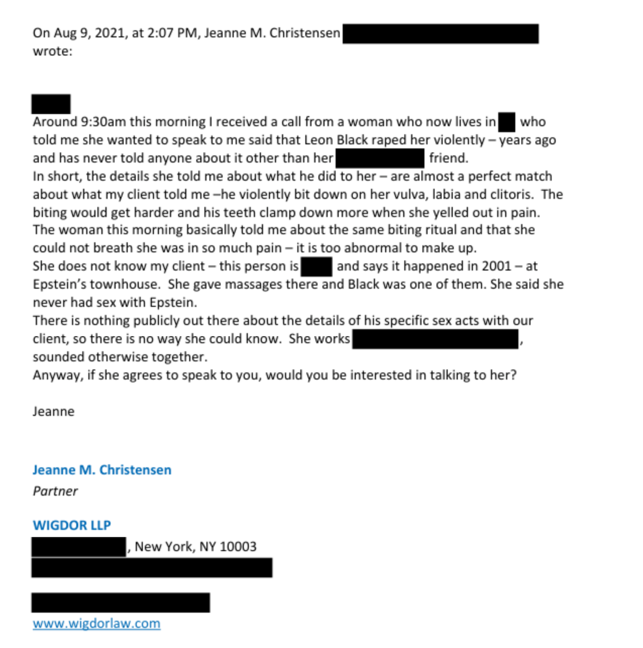 The recent document dump includes not only apparent first-person accounts from a victim, but also emails sent from Wigdor partner Jeanne M. Christensen, who formerly represented Jane Doe and another Black accuser, former Russian model Guzel Ganieva, explicitly detailing accusations against the billionaire.
