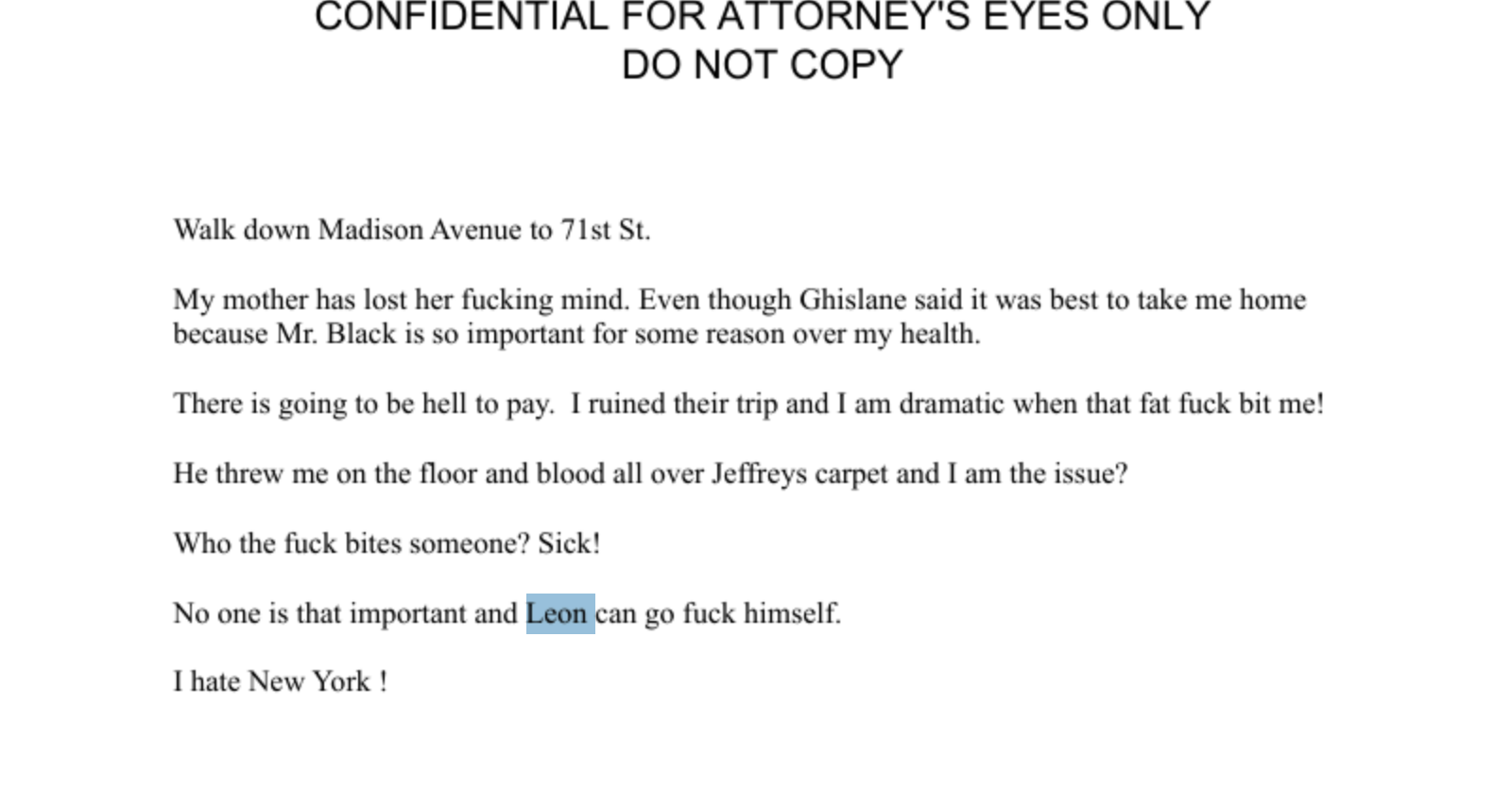 The apparent diary entries are not the only documents in the recent Epstein files that reference abuse allegations against Black. A May 2023 email between two redacted contacts containing notes from a phone call with Christensen of Wigdor LLP, Jane Doe’s former attorney, outlines multiple apparent allegations. It is unclear whether the claims pertain to Jane Doe or a separate victim or victims.