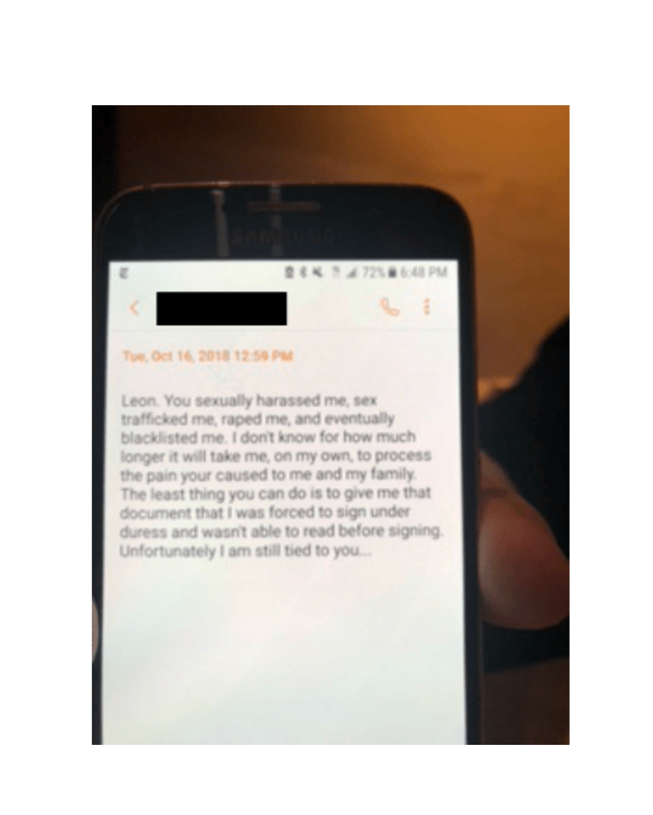 In addition to the apparent journal, emails, and phone call notes, the Epstein files include a photograph of a cell phone screen showing a message dated October 16, 2018. “Leon. You sexually harassed me, sex trafficked me, raped me, and eventually blacklisted me,” the message reads.