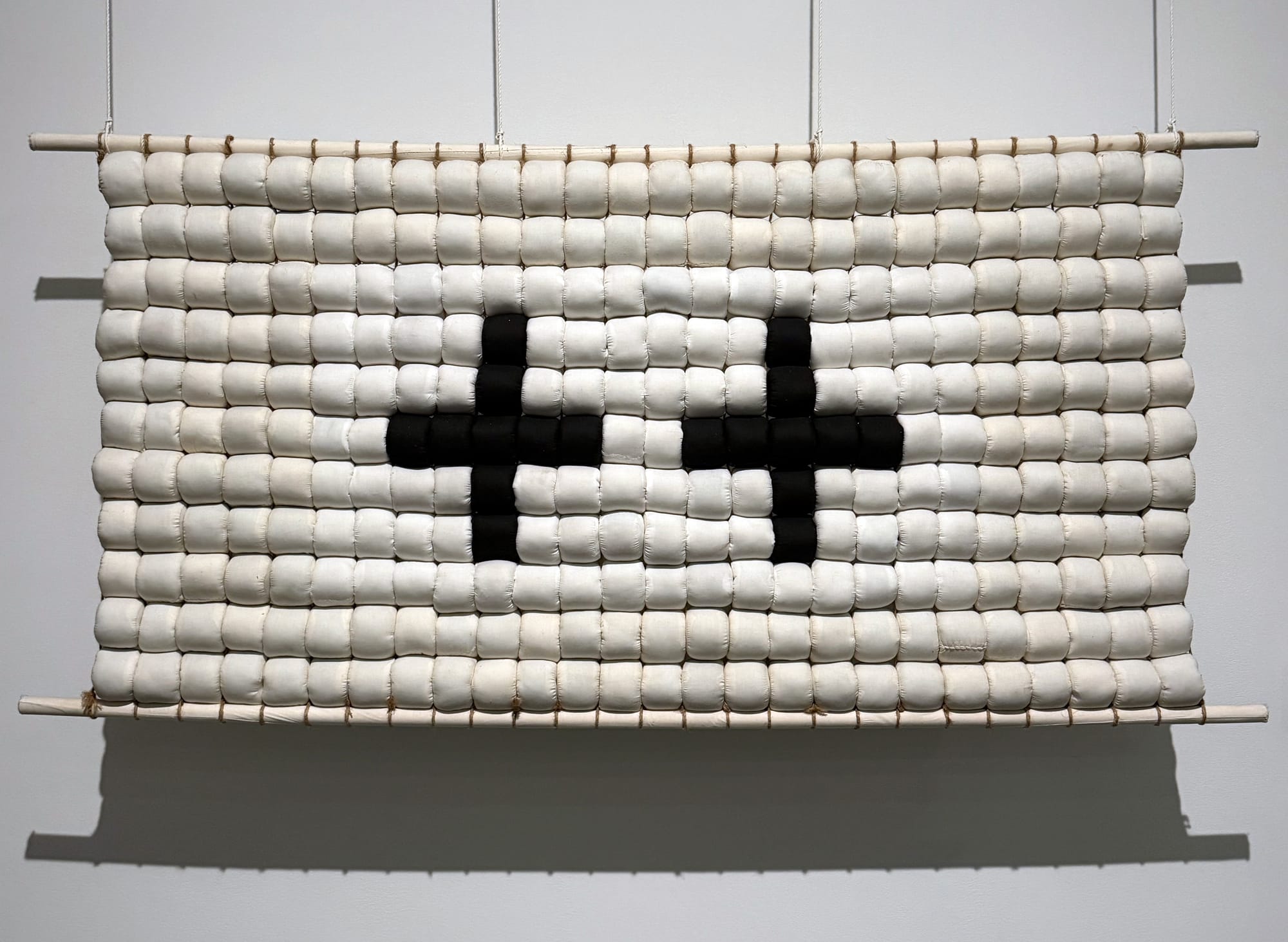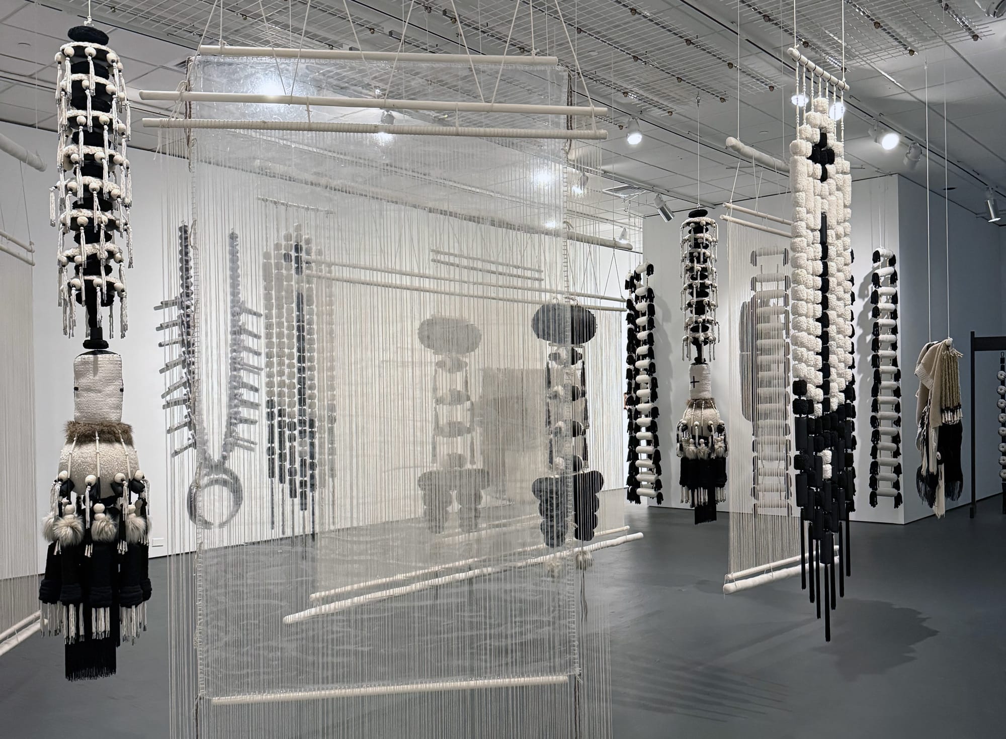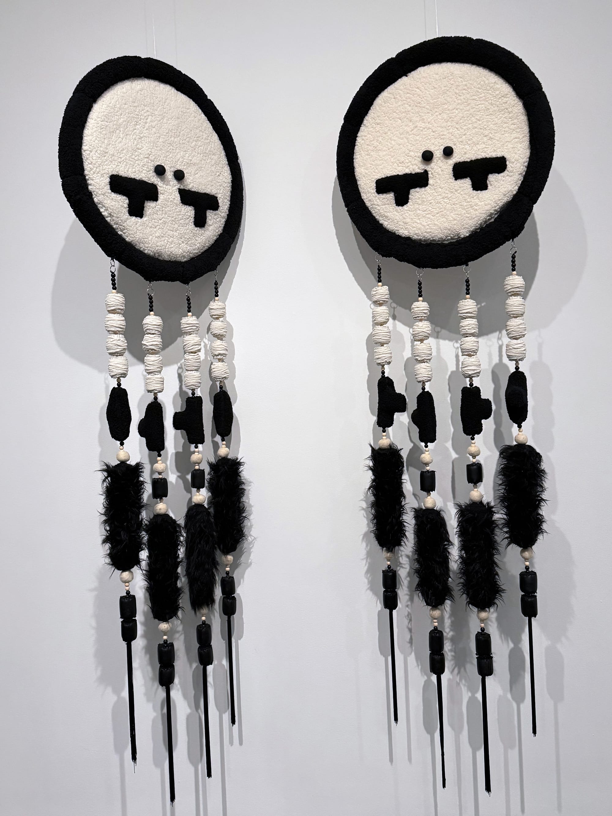 PROVIDENCE, R. I. — Sauntering from the humid Providence streets into Brown University’s David Winton Bell Gallery (the Bell), the cool contrast of Diné artist Eric-Paul Riege’s hyper-modern black, gray, and white palette will surprise you. But the coup de grâce for me, as a textile artist, is Riege’s employment of synthetic materials from retailers like Joann Fabrics and Amazon. The show's curator, Thea Quiray Tagle, encouraged me to touch the works while expounding on the maintenance guidelines Riege provided — hairspray the fur and lint roll the orbs and discs made of wool and felt.